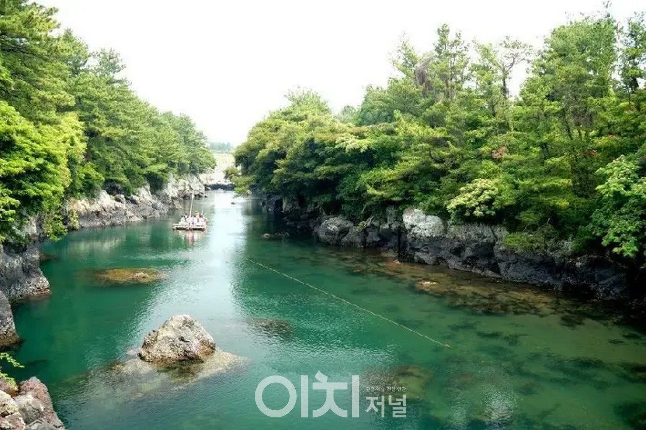 주차를 하고 잘 정돈된 길을 따라 내려가자 커다란 나무 사이로 깊은 계곡이 보이고 바다에서부터 거꾸로 뭍으로 물길을 열어 숲의 안부 깊숙이 청록빛 잔잔한 강인 것 같기도 하고 호수인 듯 아름다운 쇠소깍이 보인다.