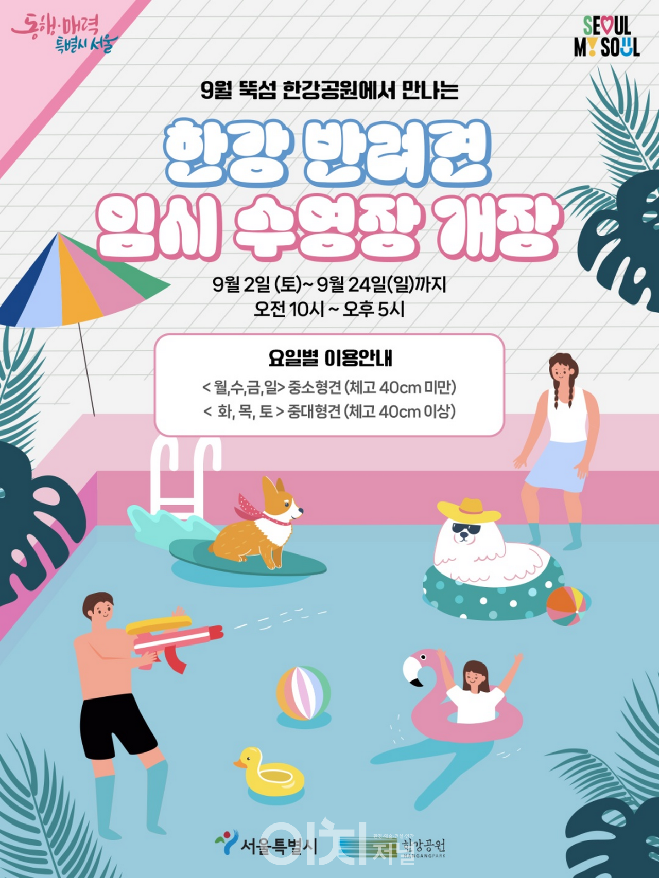 한강공원 반려견 수영장은 9.2(토)부터 9.24(일)까지 23일간 쉬는 날 없이 운영되며, 이용료는 무료이다. 동물 등록 및 광견병 예방접종을 완료한 반려견만 입장이 가능하고 맹견과 질병, 발정이 있는 견은 입장이 제한된다. 수영장 운영은 오전 10시부터 오후 5시까지로 별도 예약 없이 현장에서 선착순 입장이 가능하다.
