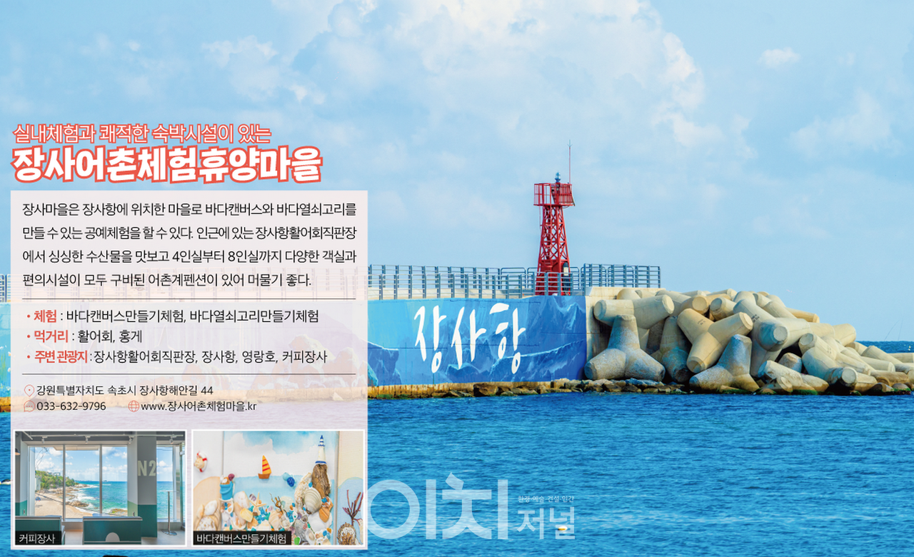 강원특별자치도 속초시에 있는 장사어촌체험휴양마을은 숙박시설의 안전, 위생 상태, 운영 관리가 우수하여 2023년 숙박부문 일등어촌으로 선정되었다. 어촌계에 있는 펜션은 4인실부터 8인실까지 다양한 크기의 방이 있으며, 바다캔버스, 바다열쇠고리 만들기 등 다양한 체험도 해볼 수 있다. 마을 바로 앞에는 싱싱한 회를 맛볼 수 있는 장사항 활어회 직판장과 바다가 보이는 카페‘카페장사(어촌계 운영)’도 있어 푸짐한 식사와 달콤한 후식을 함께 즐길 수 있다.