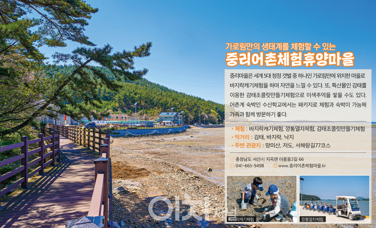 충청남도 서산시 중리어촌체험휴양마을은 2023년 어촌등급평가에서 전 부문(체험, 숙박, 음식) 1등급을 받은 어촌이다. 세계 5대 청정 갯벌 중 하나인 가로림만에 위치해 있어 넓게 펼쳐진 갯벌에서 바지락, 고둥 등을 잡는 체험을 할 수 있다. 또한, 중리마을의 특산물인 감태를 넣어 만드는 초콜릿 만들기 체험 등 실내체험도 가능하고, 마을에서 운영하는 어촌계 공동숙박인 수산학교에서 바다를 바라보며 휴식을 취하는 특별한 경험을 해볼 수 있다.