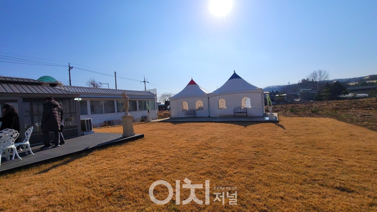 몽골텐트는 식사 케이터링을 할 수 있는 시설로 야외바베큐, 그릴, 뷔페 테이블과 10인용 식사, 테이블, 의자 썬룸식사와 다과를 즐길 수 있는 운치있는 곳으로 커피 머신. 냉난방기가 설치되어 있다.