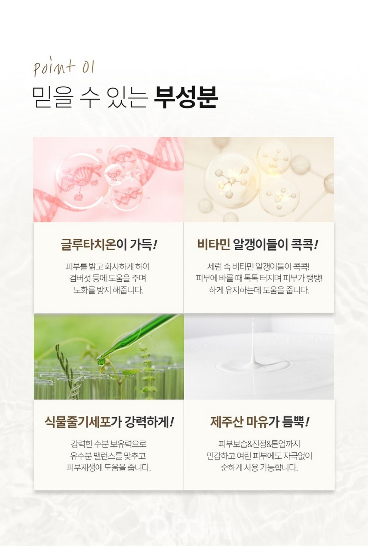 퀸봄(Queen Bom) 은 품질 ISO 22716 인증을 받았으며, 식물 줄기세포 추출물, 제주산 마유, 글루타치온 원액의 특화 성분이 들어있어 드라마틱한 피부 개선 효과를 느낄 수 있다.