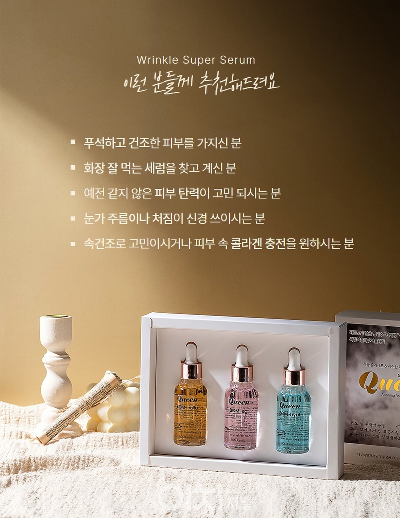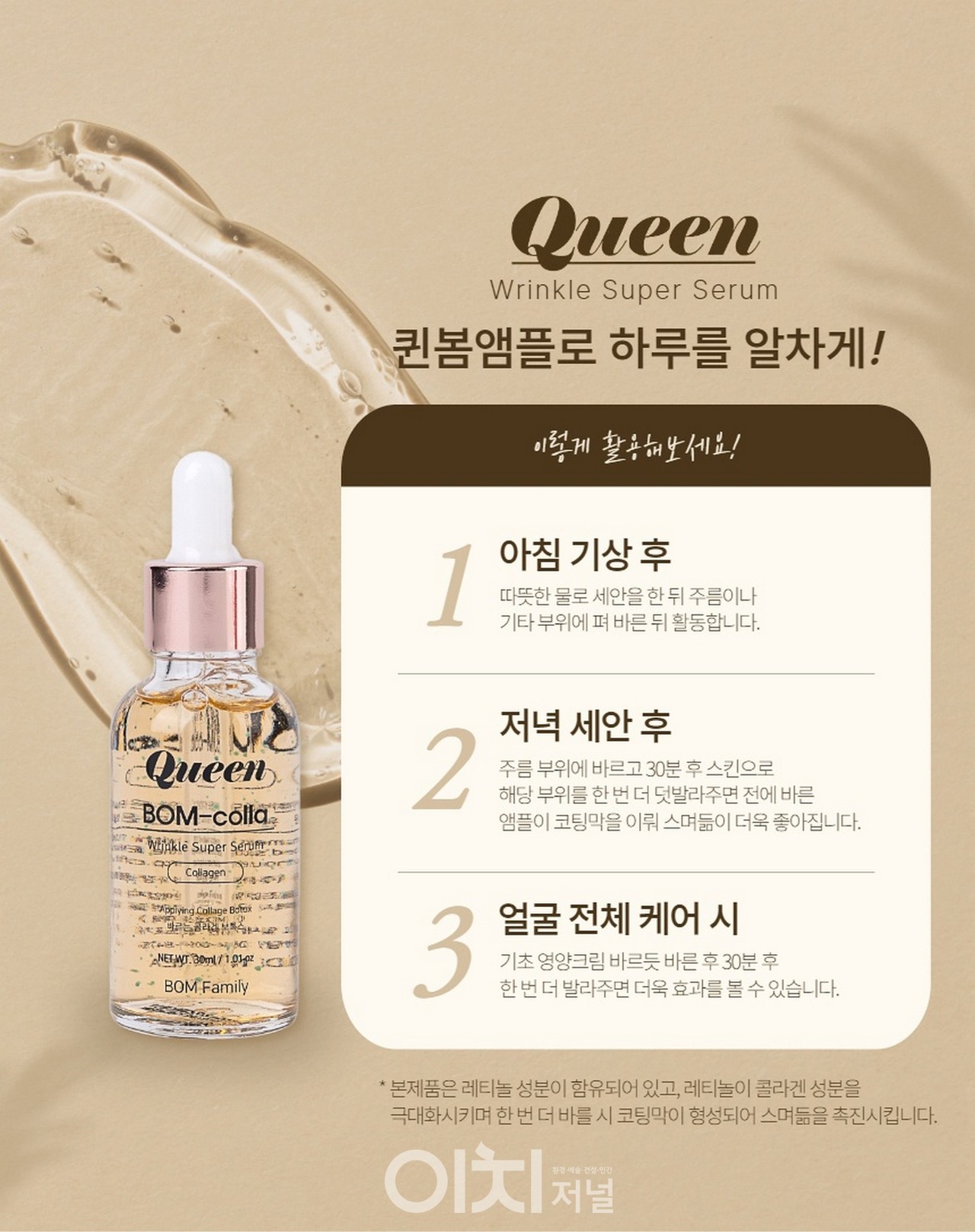 바르는 보톡스, 연예인들이 선택한 주름지우는 화장품으로 알려진 '퀸봄'은 1등급 원액 100%를 사용하며, 주름개선에 특화된 기능성 화장품이다.