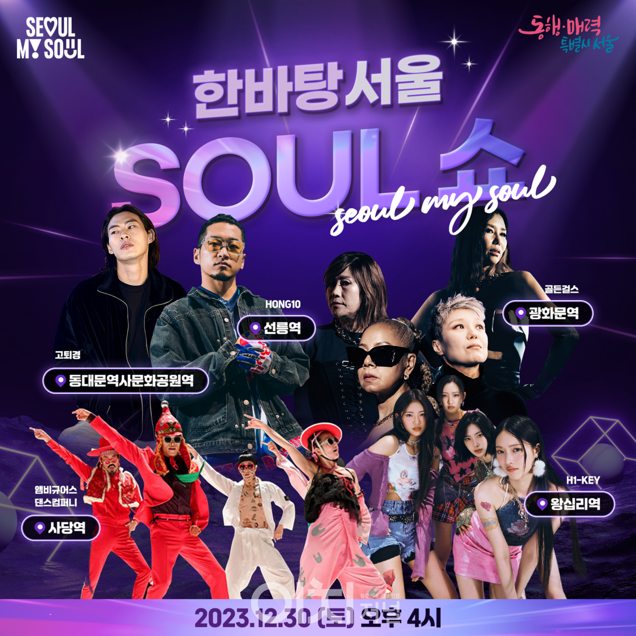 최근 화제가 되고있는 프로젝트 걸그룹 “골든걸스”를 필두로 ‘이날치-범내려온다’ 콜라보로 유명한 조선팝 댄스크루 앰비규어스, 항저우아시안게임(’23) 브레이킹부분 은메달리스트 “Hong 10”, SEOUL(Such a Beautiful City)로 데뷔한 걸그룹 “H1-KEY”, K-POP 랜덤플레이댄스로 글로벌한 팬덤을 보유한 유튜버 “고퇴경”까지 다양한 분야의 특별한 아티스트들이 시민들을 찾아갈 예정이다.