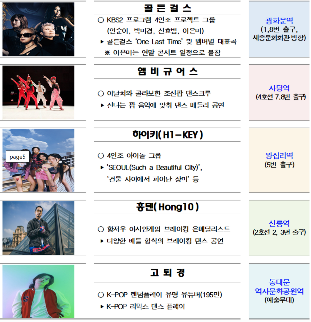 골든걸스(프로젝트 그룹 / 광화문역), 앰비규어스(조선팝 / 사당역), H1-KEY(아이돌그룹 / 왕십리역),
