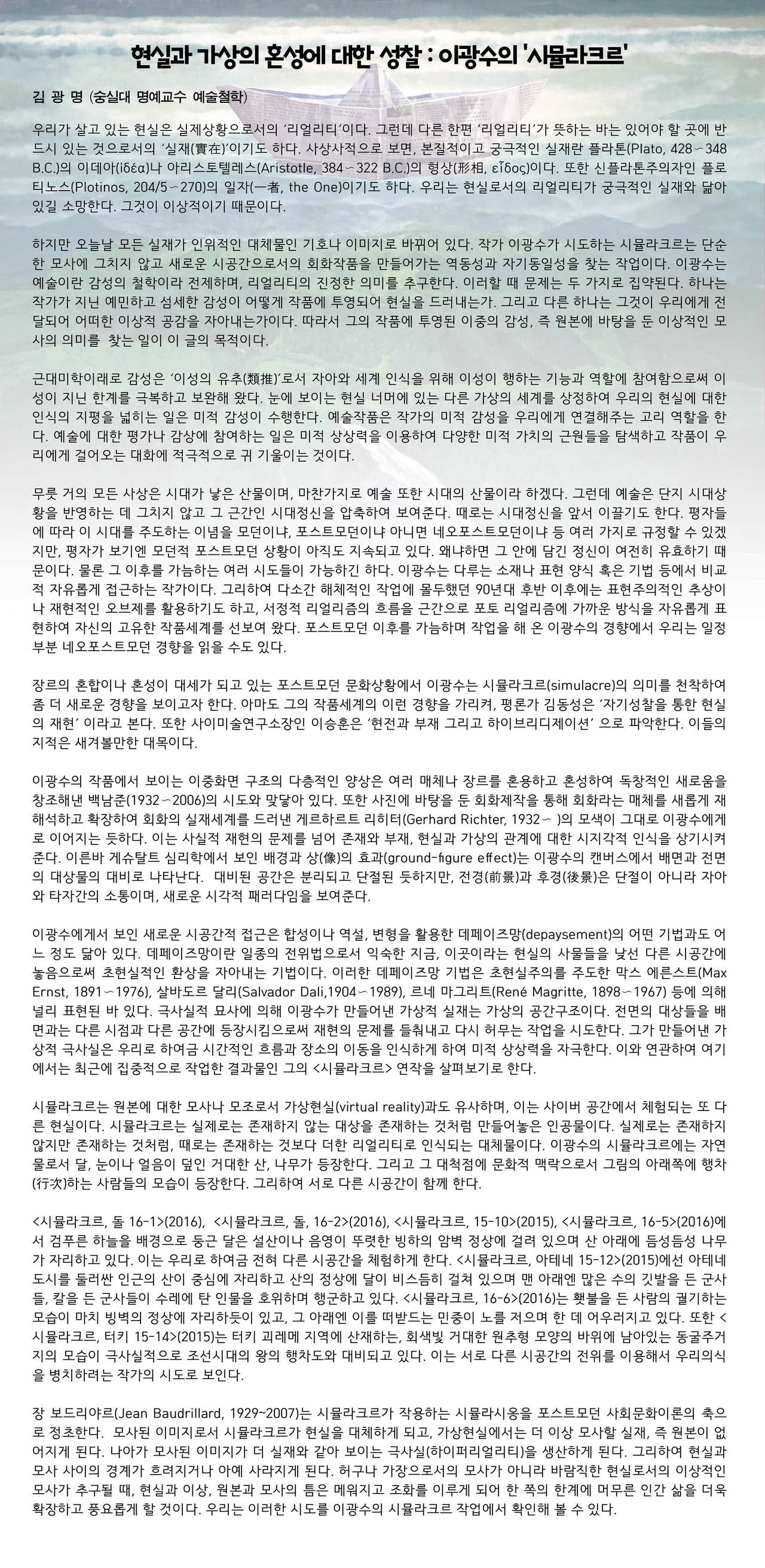 #이광수 #시뮬라크르 #현실과가상의혼성에대한성찰 #김광명 #리얼리티 #작품투영 #simulacre #자기성찰을통한현실의재현 #데페이즈망 #초현실적인환상 #가상공간 #극사실(하이퍼리얼리티) #이치저널 #지상전시