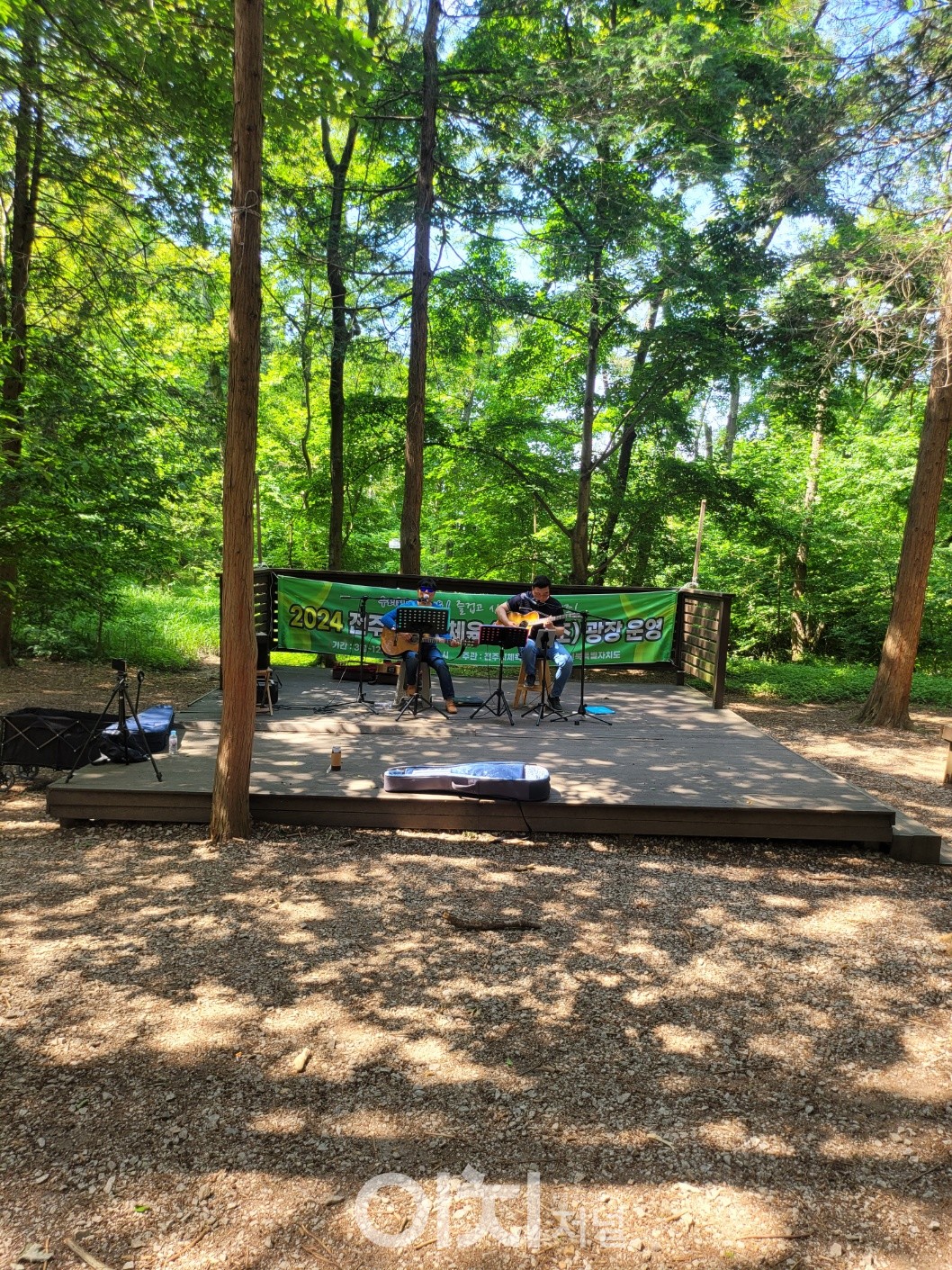 한 시간쯤 걷다가(정확하게는 숲에서 놀다가) 바로 옆 소리문화의 전당으로 향했다. 전라북도 공연 문화의 중심이다. 요즘 유행하는 프로그램들을 홍보하는 대형 현수막이 걸려있다. 소리문화의 전당을 지나 오송제로 가다 보니 야외 공연장에서 통기타 가수들이 공연을 하고 있었다. 숲 속에서 듣는 음악은 그 어디서보다도 아름다웠다. 공연을 조금 감상하다가 한 500미터 정도 가니 오송제가 나왔다. 오송제(五松提)는 저수지다. 오송제 둘레길도 산책로이고 걷기 적당한 거리다. 근처엔 대하소설 ‘혼불’을 쓰신 최명희 선생의 묘가 있다. 둘레길을 한 바퀴 걷고 오늘 특강하기로 한 전주대학교로 향했다.