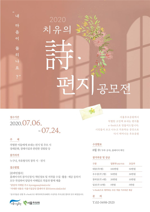 서울시설공단에서 2020년을 맞이하여 공감과 소통의 추모문화를 활성화하고자 추모 시·편지를 공모합니다. 수상작은 추모공원 갤러리에 전시되며, 응모작을 모아 e-book으로 출판할 예정이오니 시민 여러분의 많은 참여 부탁드립니다.