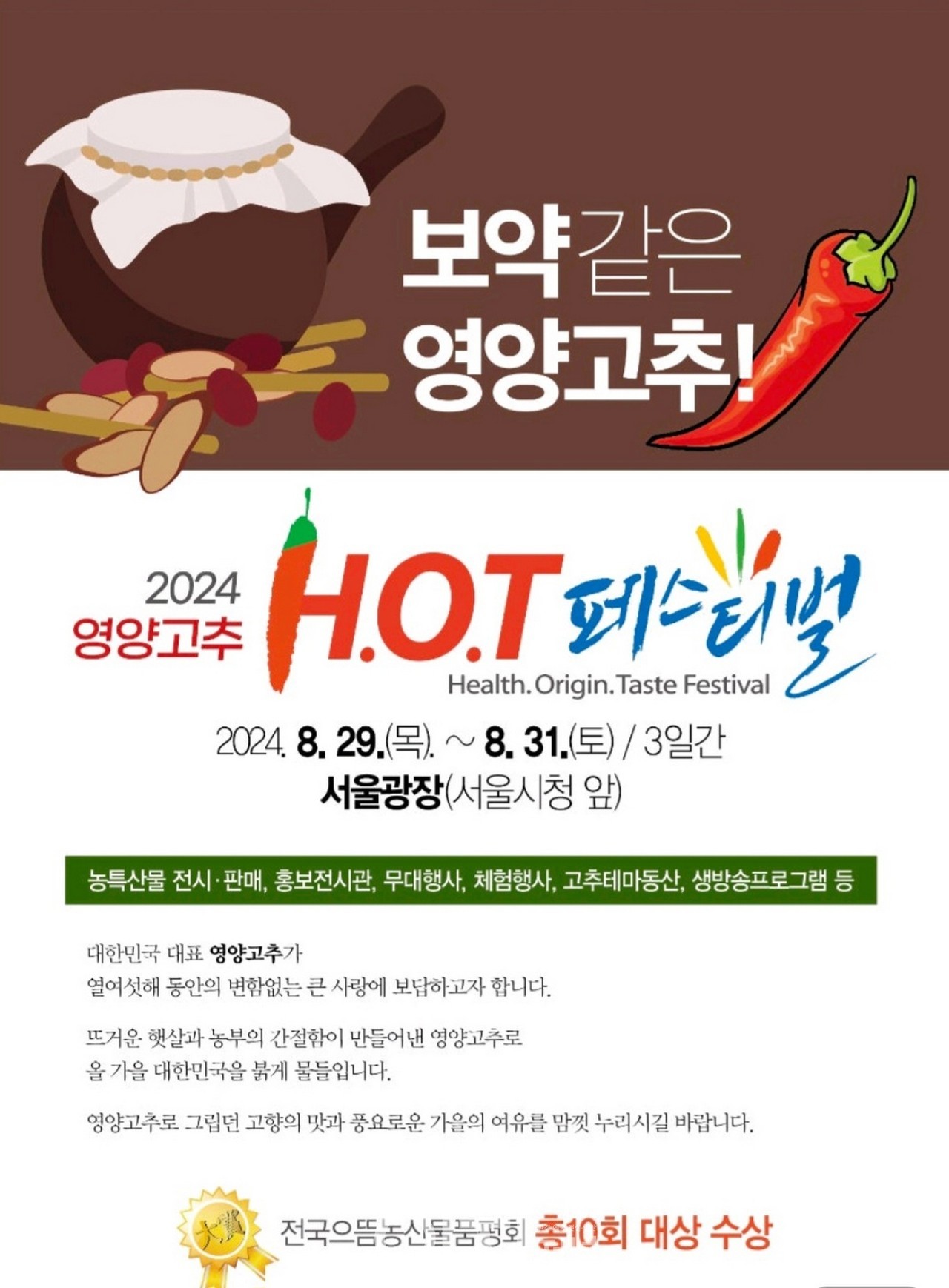 서울광장이 다시 한 번 K-매운맛으로 뜨겁게 달아오른다. ‘2024 영양고추 H.O.T 페스티벌’이 오는 8월 29일부터 31일까지 3일간 서울광장에서 개최된다. “K-매운맛 영양고추 맛보러 오이소!”라는 슬로건을 내건 이번 행사는 서울 시민들에게 영양고추의 진정한 맛을 전할 예정이다.