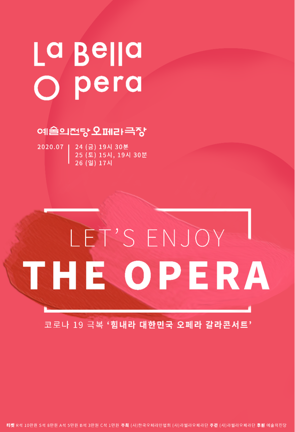 사단법인 라벨라오페라단(단장 이강호)이 2020년 7월 24일(금)부터 7월 26일(일)까지 3일간 예술의전당 오페라극장에서 <코로나19 극복 '힘내라 대한민국 오페라 갈라콘서트'>를 개최한다. 이번 공연은 코로나19로 지친 의료진과 국민들에게 감사와 응원을 전하자는 취지로 기획하였으며, 한국을 대표하는 오페라 가수들이 총출동하여 뜻깊은 무대를 선사할 예정이다.
