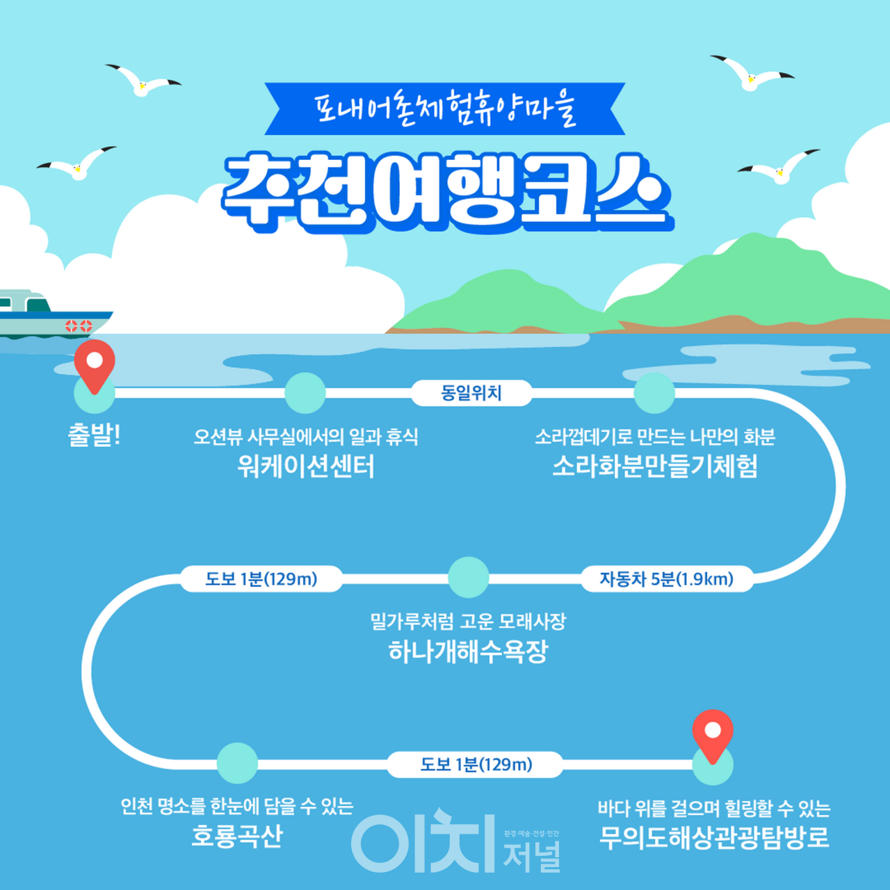 마을 중심에 위치한 워케이션센터도 인상적이다. 바다를 마주한 사무공간에서 일과 휴식을 동시에 즐길 수 있는 이곳은 도심에 지친 이들에게 색다른 힐링 장소가 된다. 노트북을 펼치면 창 너머로 푸른 바다가 펼쳐지고, 잠시 짬을 내 마을을 산책하면 섬 전체를 감싸는 평온한 기운이 몸에 스며든다.