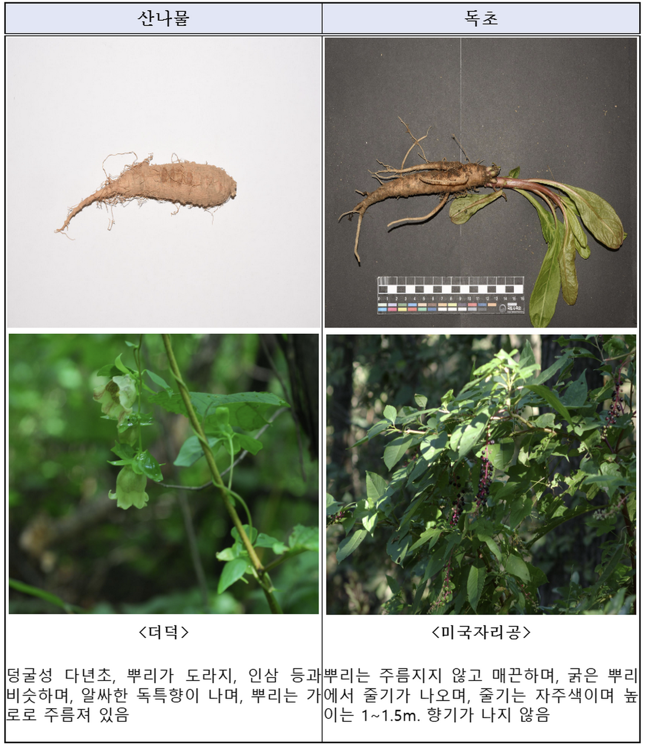 더덕과 착각하기 쉬운 ‘미국자리공’도 주의 대상이다. 더덕 뿌리는 가로로 주름이 잡혀 있지만, 미국자리공은 매끈하고 줄기가 자주색을 띤다. 향도 전혀 없다.