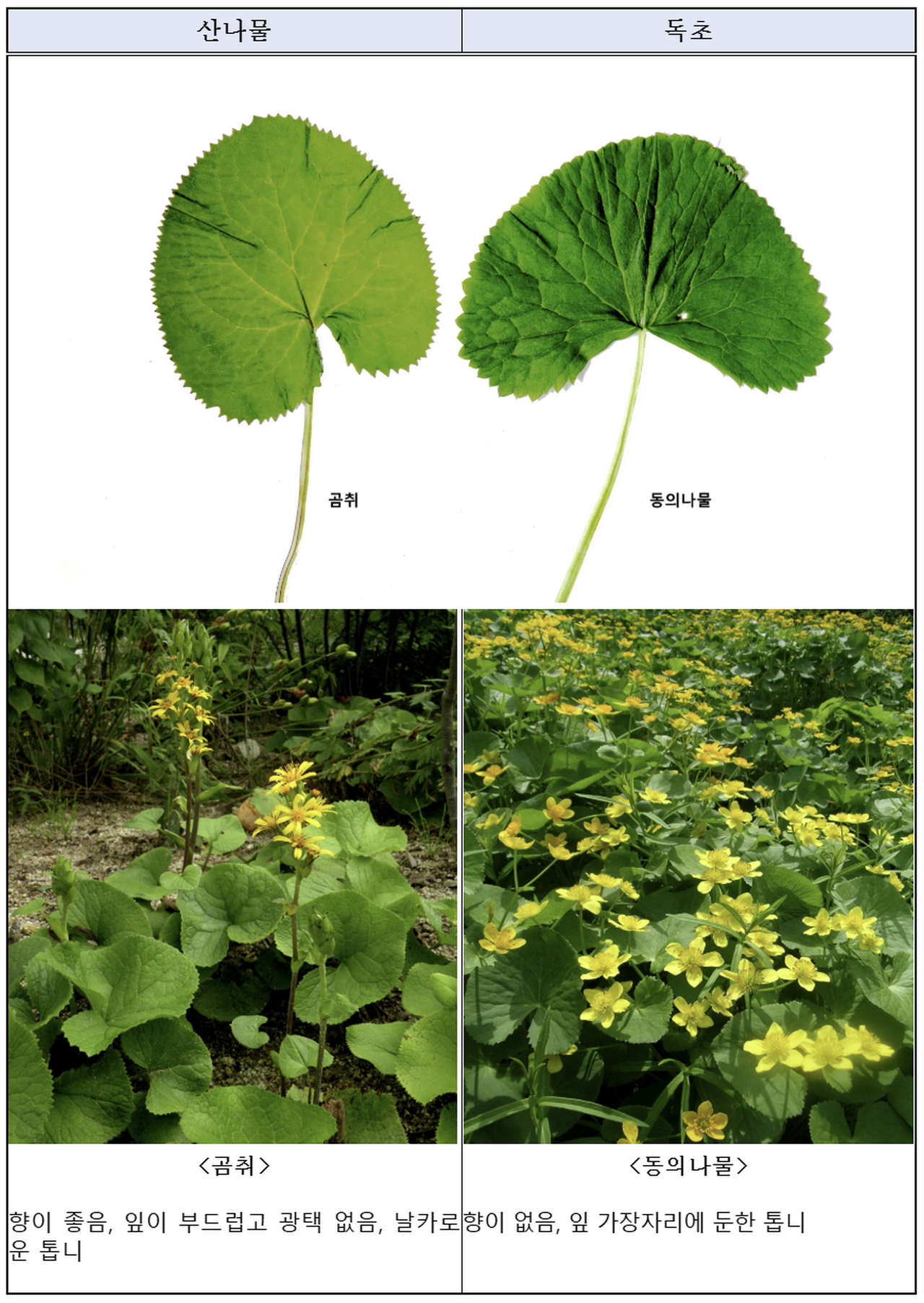 가장 흔한 오해는 곰취와 동의나물. 곰취는 부드럽고 향이 좋지만, 동의나물은 향이 없고 잎 끝에 무딘 톱니가 있다. 하지만 잎을 하나만 보고 구분하기란 쉽지 않다.