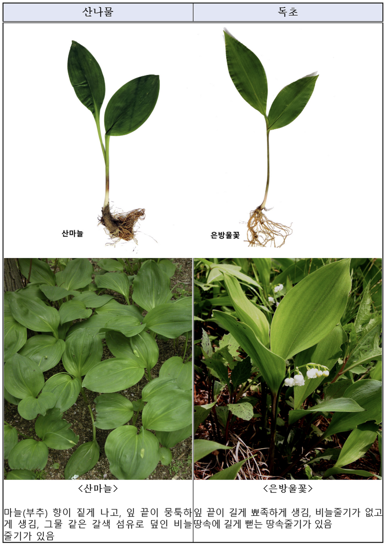 또 명이나물로 알려진 산마늘과 혼동하기 쉬운 은방울꽃은 뿌리에 강한 독을 품고 있어 특히 치명적이다. 은방울꽃은 줄기가 곧고 잎이 반들반들하며, 특유의 융기가 있다. 산마늘은 마늘 향이 진하게 나고, 줄기에 여러 장의 잎이 달린다. 향만 맡아도 차이를 느낄 수 있지만, 채취 경험이 없는 일반인은 구별하기 어렵다.