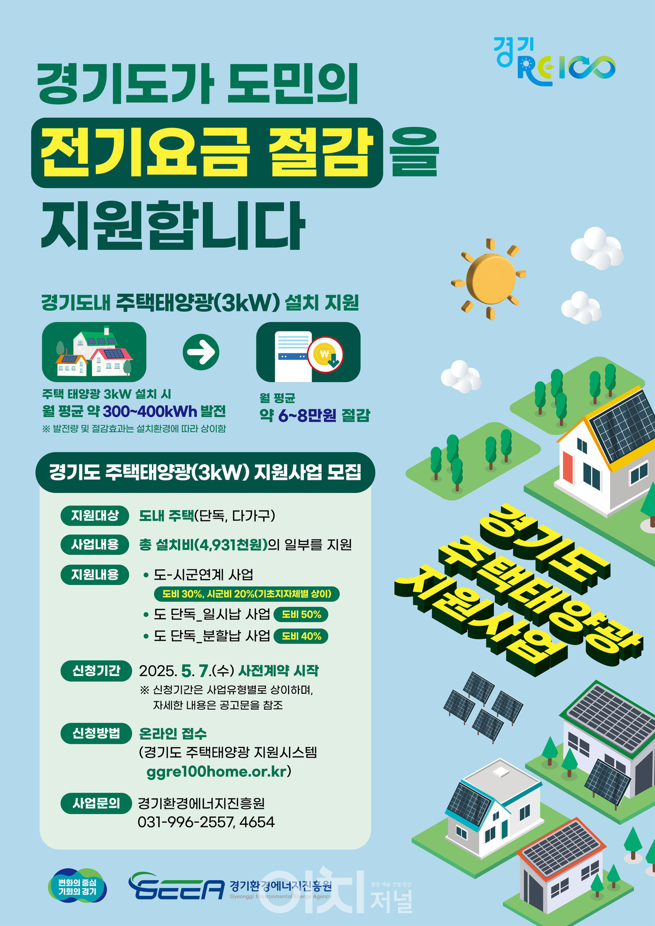 김연지 경기도 에너지산업과장은 “에너지 복지 확대를 위해 도비를 활용한 지원 비중을 높였고, 누구나 참여 가능한 구조로 문턱을 낮췄다”며 “에너지 자립과 탄소중립을 동시에 실현할 이번 사업에 많은 도민들이 관심을 가져주길 기대한다”고 밝혔다.