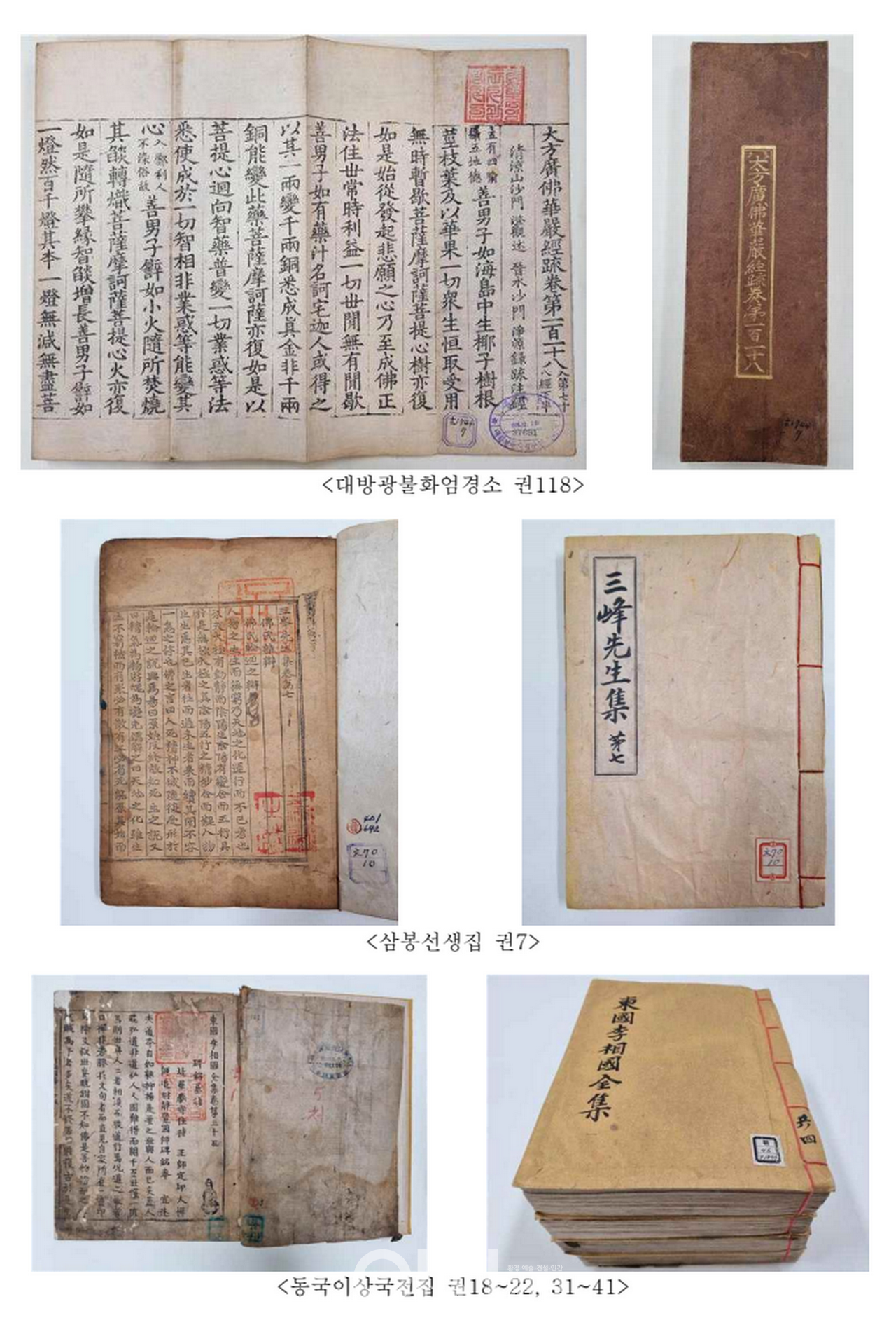 한편 보물로 새롭게 지정된 3건의 전적도 각각의 사료적·학술적 가치가 두드러진다. 「대방광불화엄경소 권118」은 고려 후기 의천이 송나라에서 들여와 간행한 불경의 일부로, 1602년에 인출된 인본(印本)이다. 상수리나무 열매로 물들인 상지에 금니로 표제를 쓰는 등 조선 전기 고서의 물리적 특성이 잘 남아 있으며, 한·중·일 삼국 간 불교 교류의 단면을 보여주는 대표적인 유물로 손꼽힌다.