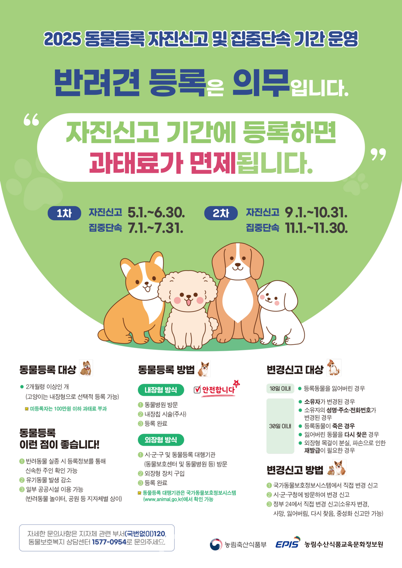 농식품부 관계자는 “반려견 등록은 단순한 행정절차가 아니라 동물을 생명으로 존중하고 가족으로 책임지는 출발점”이라며, “올해는 신고기간을 2회로 늘려 보다 많은 반려인이 참여할 수 있도록 했다. 지금이 바로 참여할 때”라고 강조했다.