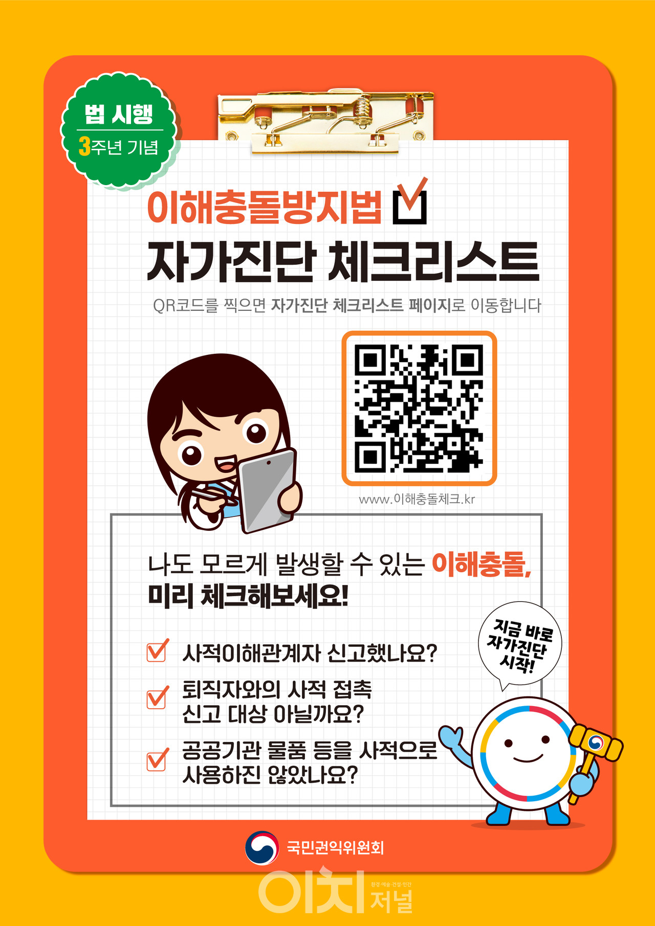 국민권익위원회가 오늘(19일)부터 ‘이해충돌 자가진단 서비스’를 전격 시행하며 공직사회에 새로운 셀프 체크 문화를 도입했다. 이는 공직자의 공정한 직무수행을 방해하는 이해충돌 가능성을 사전에 점검하고 예방할 수 있도록 하기 위한 실질적 조치다. 누구나 QR코드 스캔만으로 전용 웹사이트에 접속해 자신의 상황이 이해충돌에 해당하는지 손쉽게 진단할 수 있다.