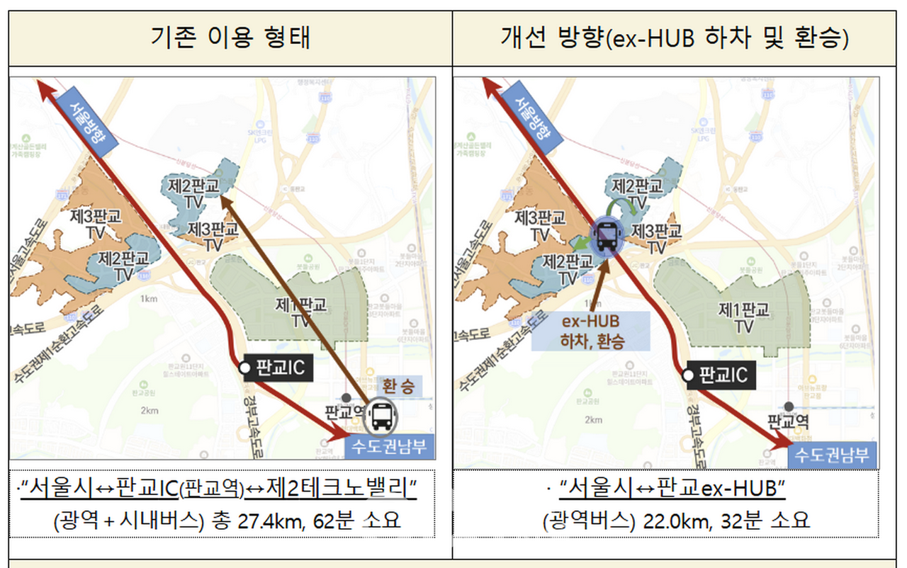 지금까지 서울에서 판교 제2테크노밸리로 가기 위해서는 광역버스를 타고 경부고속도로 판교IC에서 빠져나와 판교역에서 하차한 뒤, 다시 시내버스로 갈아타야 했다. 이 복잡한 과정은 총 27.4km 거리, 약 62분이 걸리는 여정이었다. 그러나 판교 ex-HUB가 문을 열면, 환승 없이 곧바로 광역버스로 이동 가능해지며 총 거리도 22.0km로 줄고 소요 시간도 32분으로 대폭 줄어든다. 여기에 창업로, 달래내로를 오가는 시내버스 10개 노선과의 연계도 가능해진다.