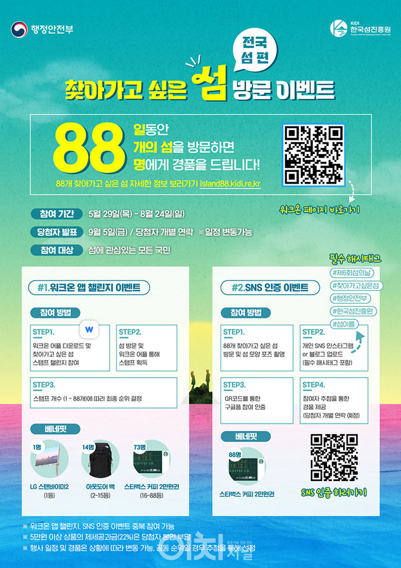 이와 함께 행안부는 국민들의 섬 여행을 독려하고 섬의 매력을 체험할 수 있도록 5월 29일부터 8월 24일까지 ‘88일간의 섬 방문 챌린지’를 개최한다. 단순히 여행을 다녀오는 것에 그치지 않고, 모바일앱 ‘워크온’과 개인 SNS 인증을 통해 참여할 수 있도록 기획됐다. 참여자에게는 경품이 제공되며, 당첨자는 9월 중 개별 안내된다. 이벤트 참여 방법과 섬 정보는 ‘찾아가고 싶은 섬 누리집(island88.kidi.re.kr)’에서 확인할 수 있다.