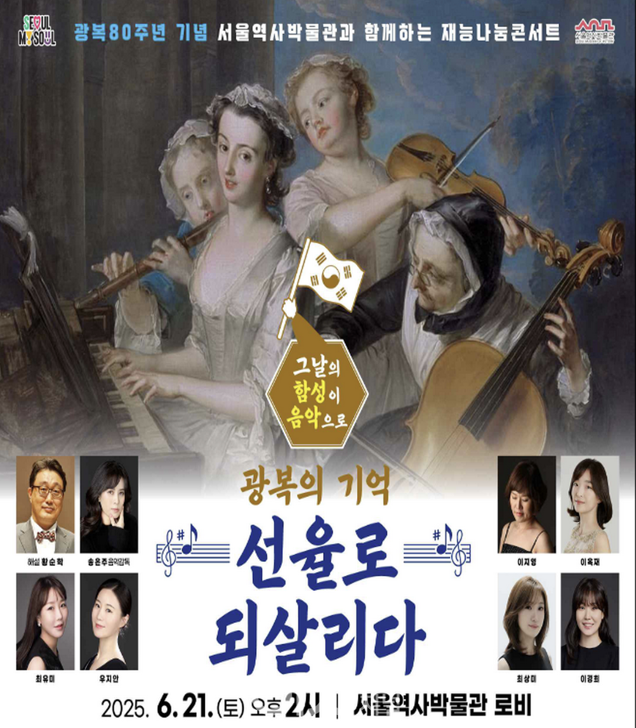 서울역사박물관의 재능나눔콘서트는 2012년부터 이어져 온 문화예술인의 재능기부 프로젝트다. 올해는 광복 80주년을 맞아 총 3회에 걸쳐 개최된다. 두 번째 공연은 8월 16일 ‘되찾은 땅, 되살아난 노래’, 마지막 공연은 11월 15일 ‘하프시코드의 울림, 한국인의 마음을 담다’라는 제목으로 진행될 예정이다.