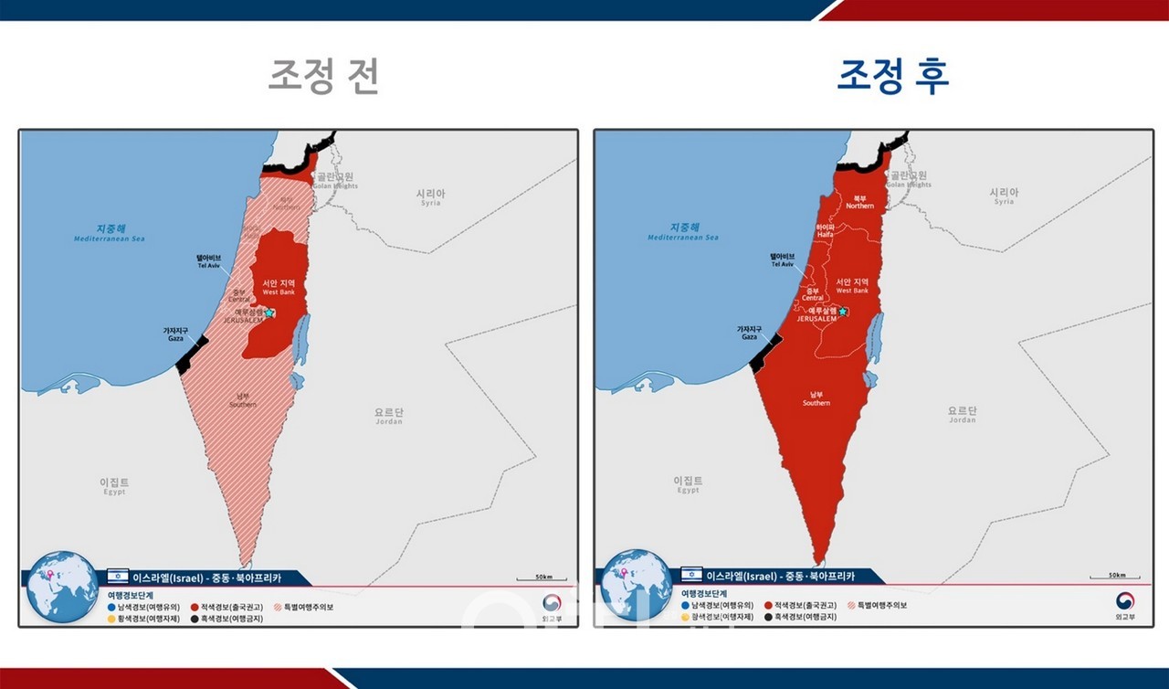 이번 조치로 현재 이스라엘 내 여행경보는 아래와 같이 재정비됐다. 레바논과 인접한 이스라엘 북부 접경지역(국경으로부터 4km 이내)과 가자지구는 여전히 최고 수위인 4단계(여행금지)가 유지된다. 그 외 전역은 모두 3단계(출국권고)로 지정됐다.