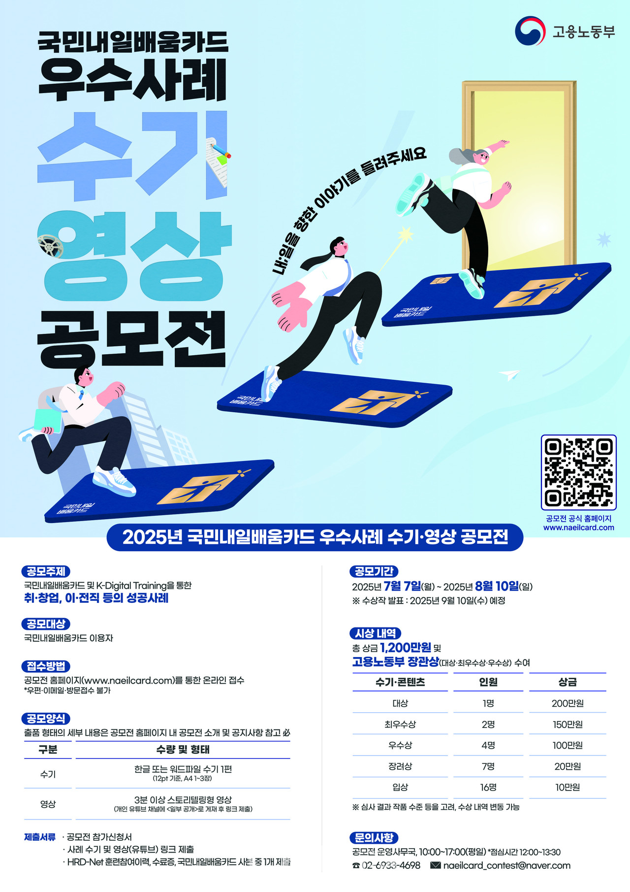 이번 공모전은 7월 7일부터 8월 10일까지 진행되며, 국민내일배움카드(www.naeilcard.com)를 통해 직업훈련을 받고 취업, 창업, 이직에 성공한 국민이라면 누구나 참여할 수 있다. 수기 또는 영상 형식으로 자신의 훈련 참여 동기, 과정 중 경험, 성취한 변화와 성장을 자유롭게 표현하면 된다.