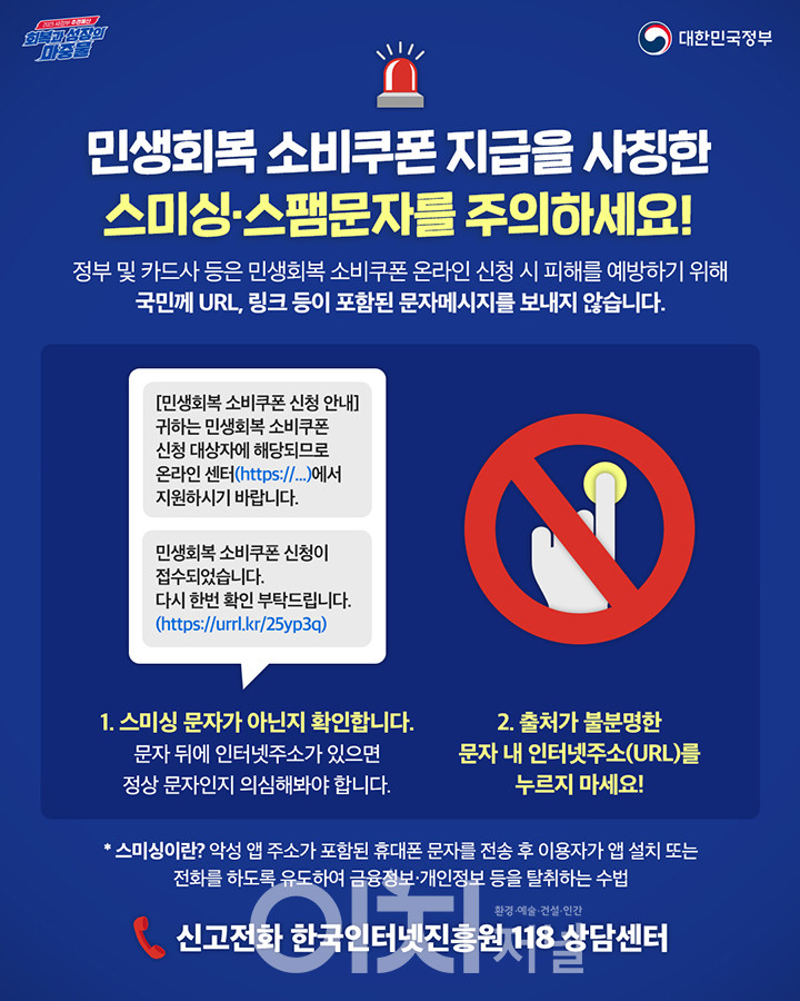 소비쿠폰 신청이라는 문구에 홀려 문자를 클릭하는 순간, 당신의 개인정보는 이미 제3자의 손에 넘어갔다. 올여름 정부가 추진 중인 ‘민생회복 소비쿠폰’ 지급을 앞두고, 그 대상을 사칭한 스미싱 공격이 기승을 부리고 있다. 링크가 포함된 안내 문자나 SNS가 왔다면, 정부도 카드사도 아니다. 그건 100% 사기다.