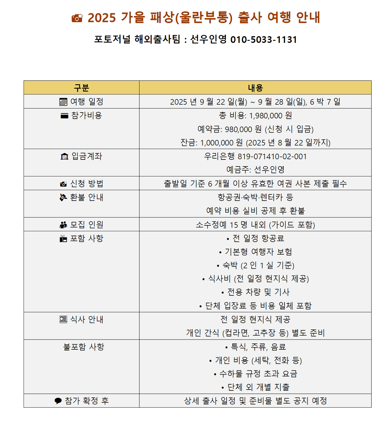 울란부통의 숙소는 대체로 촬영지와 가까우며, 촬영 일출·일몰에 모두 대응 가능하다. 고도 차가 큰 곳도 있지만 대부분 차량으로 접근 가능하며, 숙소에서 새벽에 바로 출발해 해 뜨기 전 도착할 수 있다.