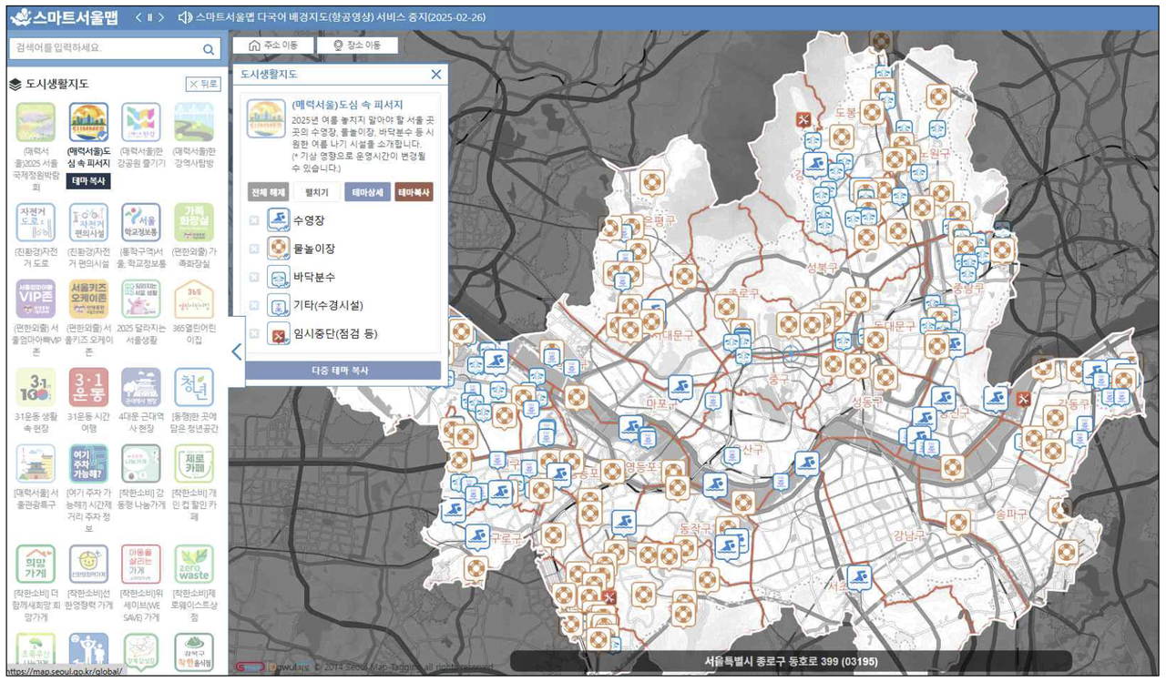 스마트서울맵 첫 화면에서 ‘도시생활지도’ 테마를 클릭하면 도심 속 피서지 지도가 펼쳐진다. 수영장 26곳, 물놀이장 106곳, 바닥분수 62곳, 수경시설 45곳 등 총 239곳이 촘촘히 표시되어 있다.