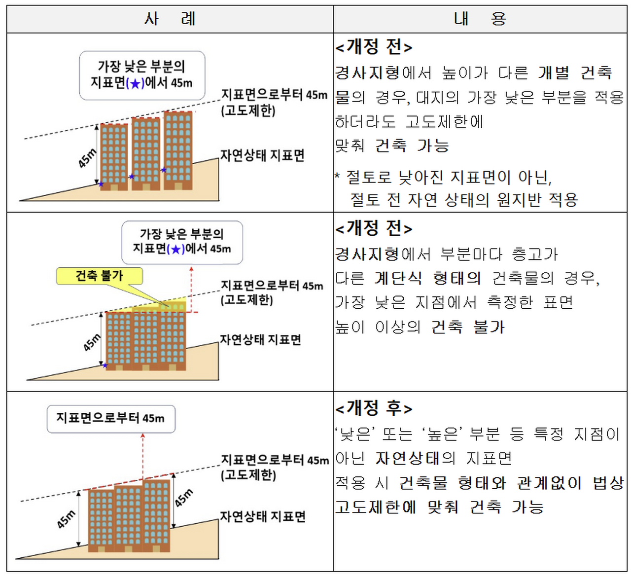 지금까지는 건축물 대지 중 ‘가장 낮은 부분’을 기준으로 높이를 산정했다. 이로 인해 법률상 허용된 높이임에도 불구하고 경사지나 계단식 아파트의 경우 시행령 규정에 따라 건축이 제한되는 사례가 적지 않았다. 특히 개발 여건이 좋은 지역임에도 불구하고 군사시설보호구역 규제 탓에 사업 추진이 무산되는 등 지역 발전과 주택 공급에도 차질이 발생했다.