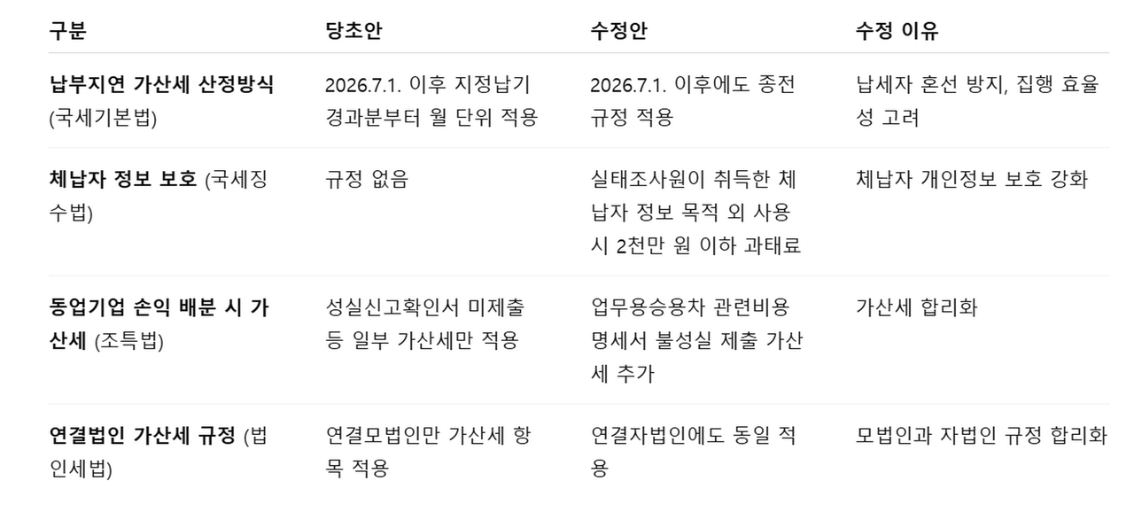 이번 개정안은 국세기본법, 국세징수법, 조세특례제한법, 법인세법, 소득세법, 상속세 및 증여세법, 종합부동산세법, 부가가치세법 등 주요 세목을 망라한다. 당초 발표안과 달리 납부지연 가산세 산정 방식, 체납자 정보 보호, 동업기업과 연결법인의 가산세 규정 등이 일부 수정되었다.