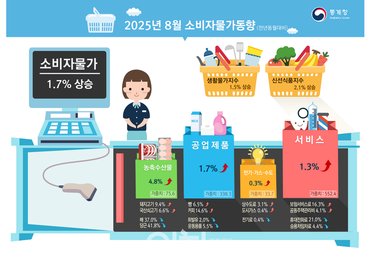 2025년 8월 소비자물가지수(CPI)가 116.45(2020=100)로 집계됐다. 전월보다 0.1% 하락했지만, 전년 동월 대비로는 1.7% 상승했다. 이는 전월 상승률(2.1%)보다 0.4%포인트 낮은 수준이다.