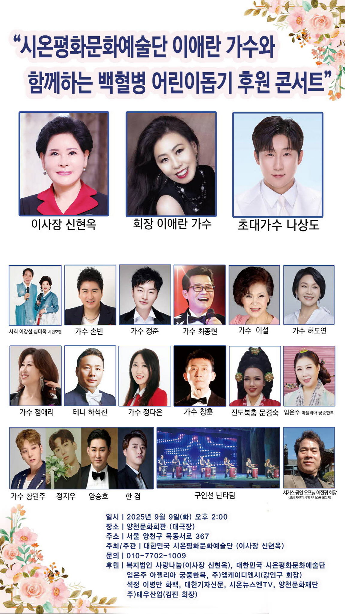 가을의 초입, 서울 양천문화회관 대극장이 특별한 울림으로 물든다. 오는 9월 9일 오후 2시, ‘시온평화문화예술단 이애란 가수와 함께하는 백혈병 어린이돕기 후원 콘서트’가 막을 올린다.