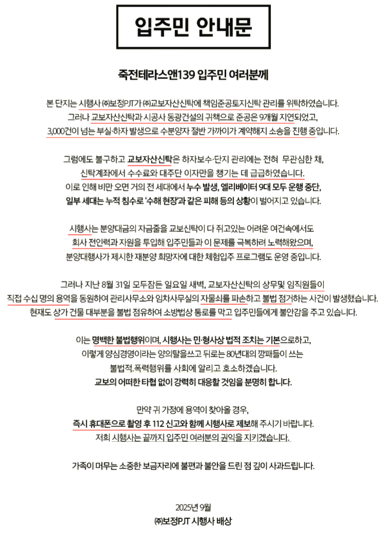 시행사 ㈜보정PJT 측은 이번 사태를 두고 “불법 소지가 있는 행위”라며 강하게 문제를 제기했다. 시행사에 따르면 죽전테라스앤139는 준공이 이미 9개월가량 지연된 상황에서 3,000건이 넘는 하자가 발생했고, 수분양자 절반 가까이가 계약 해지를 요구하며 소송에 돌입했다. 그럼에도 불구하고 교보자산신탁이 책임준공토지신탁 관리자로서 제 역할을 다하지 않고 있다는 것이 시행사 측 주장이다.