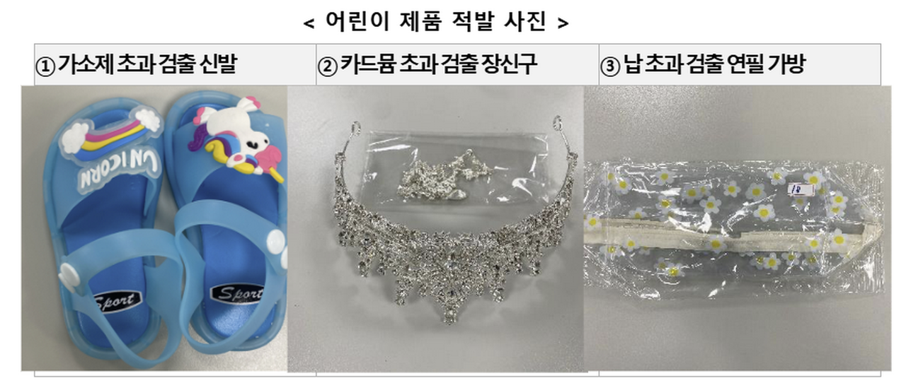 어린이제품에서는 기준 초과 정도가 특히 충격적이다. 관세청 검사 결과, 어린이 신발에서 프탈레이트계 가소제가 기준치의 최대 405배, 어린이 장신구에서는 카드뮴이 기준치의 최대 5,680배, 연필 가방에서는 납이 기준치의 최대 15배까지 검출됐다. 국내 기준은 어린이제품 공통안전기준에 따라 프탈레이트계 가소제 총합 0.1% 이하, 카드뮴 75 mg/kg 이하, 납 100 mg/kg 이하로 매우 엄격하다. 프탈레이트계 가소제는 내분비계 교란물질로 발달·생식기능에 악영향을 줄 수 있으며, 카드뮴은 국제암연구소(IARC)가 지정한 그룹1 발암물질이다. 납은 신경계·신장 등 다수 기관에 장기적 손상을 일으킬 수 있어 어린이가 장기간 접촉하거나 섭취하면 치명적 위험을 초래한다.