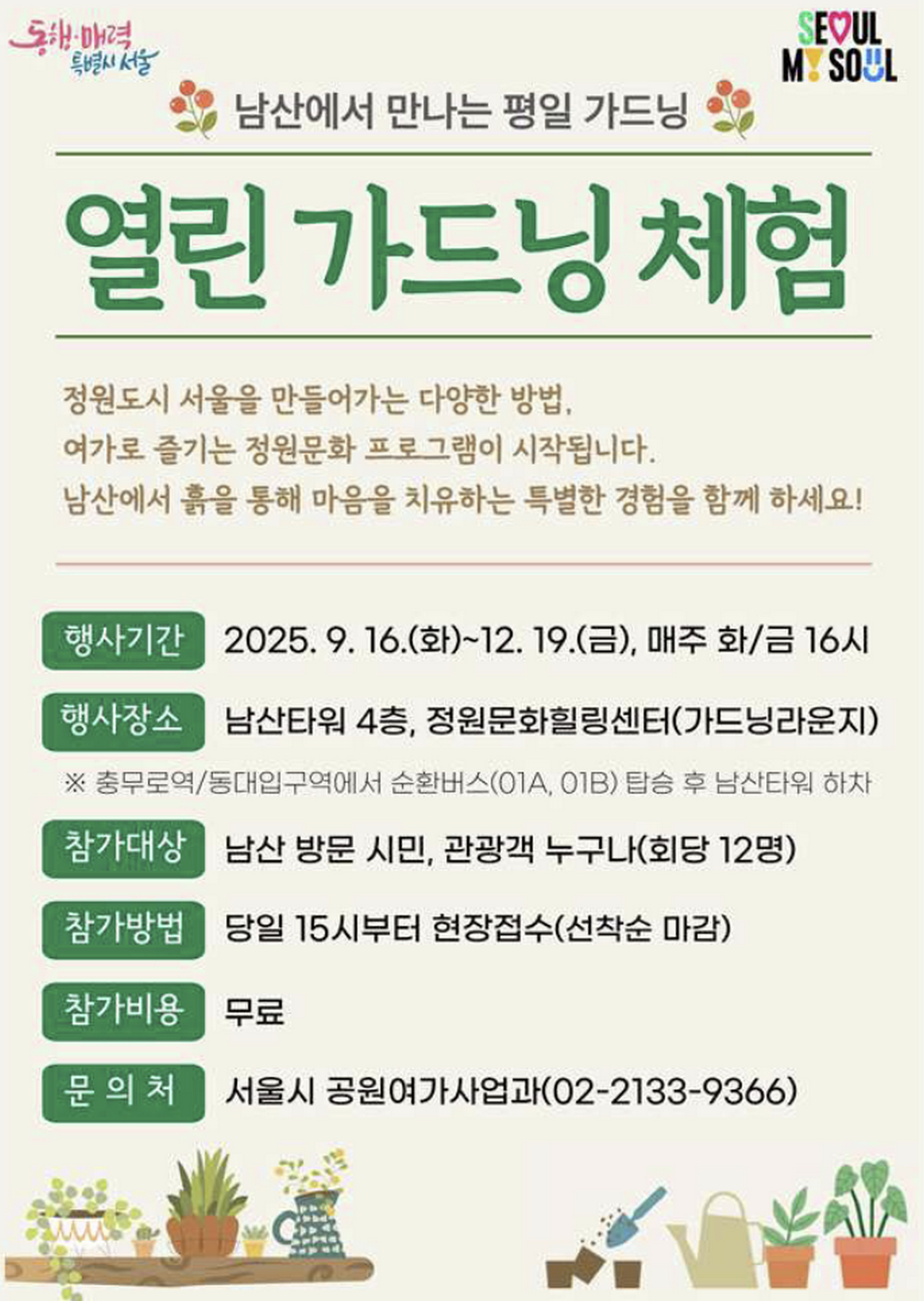 도심 속 랜드마크 남산타워가 ‘정원 힐링 스팟’으로 변신한다. 서울시는 남산서울타워 4층 ‘서울 정원문화힐링센터(가드닝 라운지)’에서 9월 16일부터 12월까지 매주 화요일과 금요일 오후 4시에 ‘열린 가드닝 체험’을 운영한다고 밝혔다. 기존 주말 프로그램에 이어 평일에도 시민과 관광객이 흙을 만지고 식물을 가꾸며 마음을 치유할 수 있도록 문턱을 낮춘 것이다.