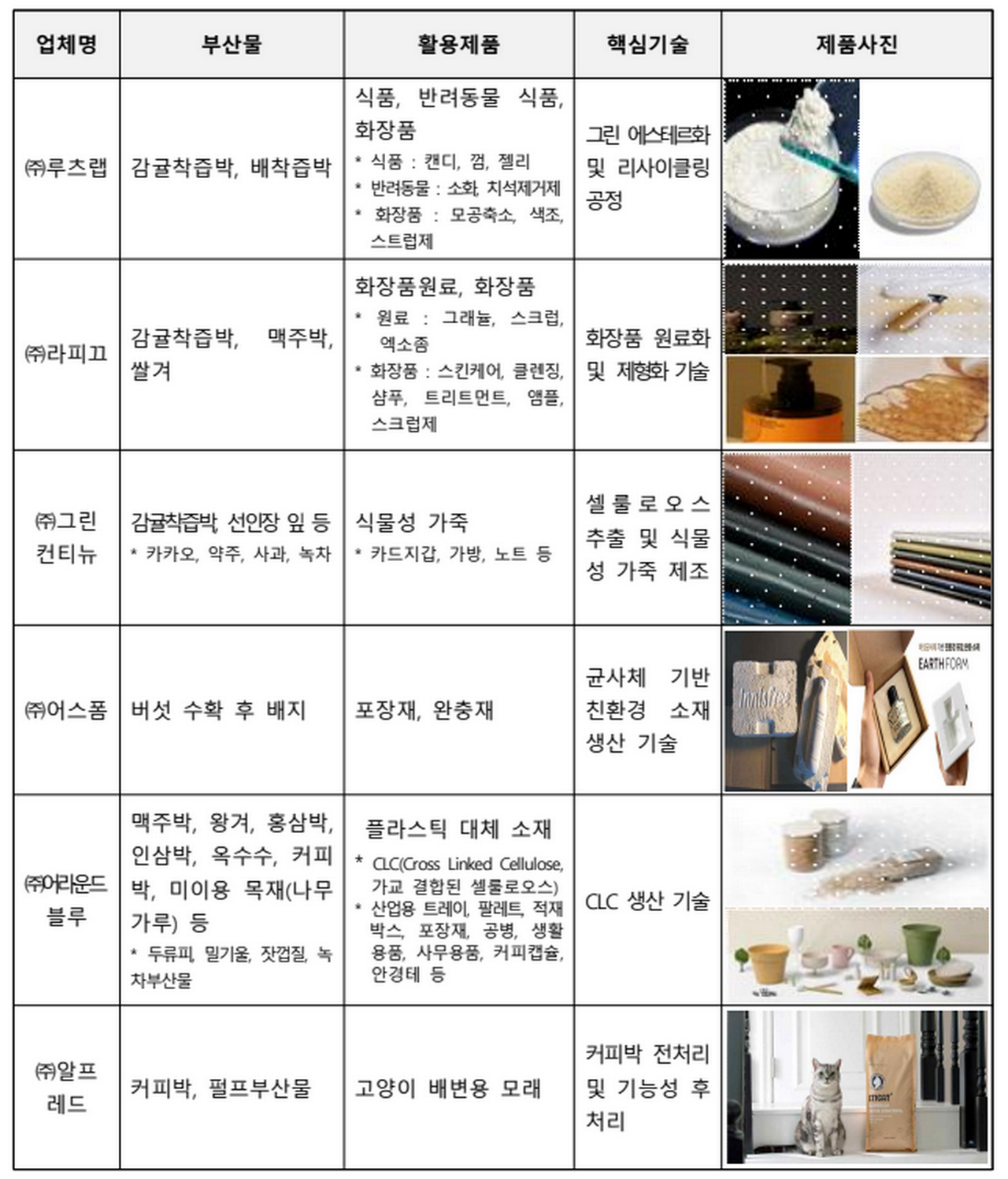 이번에 승인된 특례는 산업 영역을 크게 확장했다. △배·감귤 착즙박을 활용한 식품·반려동물식품·화장품(㈜루츠랩), △감귤 착즙박·맥주박·쌀겨를 활용한 화장품 원료화 기술(㈜라피끄), △감귤 착즙박·선인장 잎에서 셀룰로오스를 추출해 만든 식물성 가죽(㈜그린컨티뉴), △버섯 수확 후 남은 배지를 가공한 친환경 포장재·완충재(㈜어스폼), △맥주박·왕겨·옥수수·커피박으로 만든 플라스틱 대체 소재(㈜어라운드블루), △커피박·펄프 부산물을 활용한 고양이 모래(㈜알프레드) 등이다. 이들 기업은 앞으로 2년간 시제품 판매와 함께 안전성 검증, 소비자 반응 조사, 환경성 평가를 진행한다.