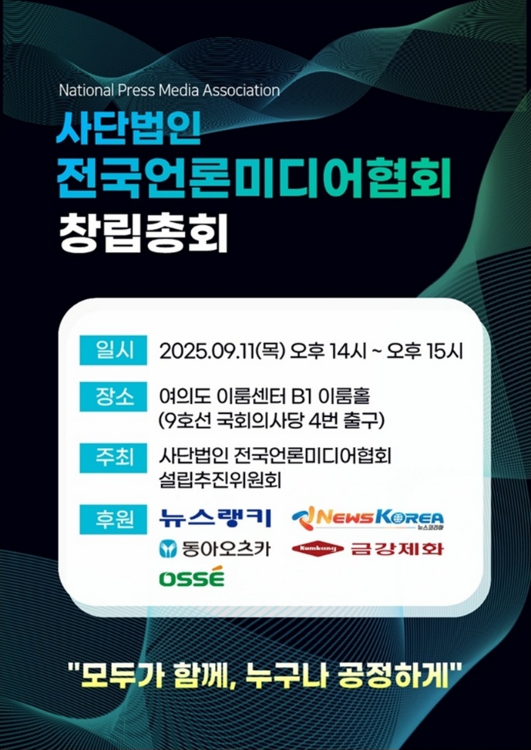 사단법인 전국언론미디어협회가 9월 11일 서울 여의도 이룸센터 B1 이룸홀에서 창립총회를 열고 공식 출범을 알렸다. 협회의 모토는 “모두가 함께, 누구나 공정하게”로, 언론 생태계의 상생과 공정성을 핵심 가치로 내세웠다.