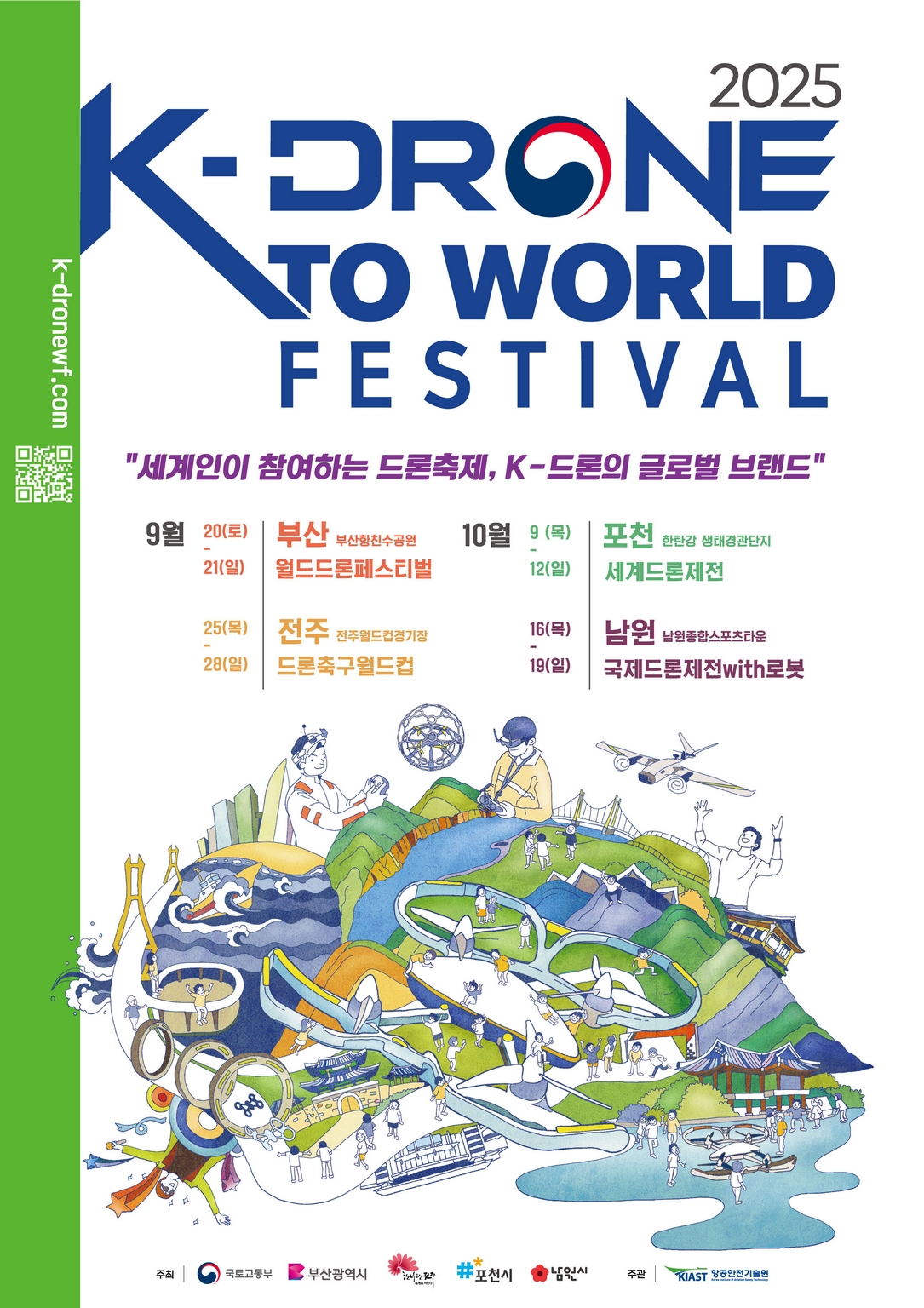 하늘 위에서 펼쳐지는 미래 스포츠의 장, ‘K-Drone to World Festival’이 올해 처음 열린다. 국토교통부는 9월 20일부터 10월 19일까지 한 달간 부산, 전주, 포천, 남원에서 릴레이 방식으로 세계적인 드론 축제를 개최한다고 밝혔다. 드론축구월드컵, 세계드론라이트쇼, 국제드론레이싱대회, 드론산업 국제심포지엄 등 드론을 활용한 다채로운 스포츠와 공연, 산업 교류의 장이 마련돼 ‘K-드론’의 기술력과 한국형 드론 문화의 매력을 세계인 앞에 선보인다.