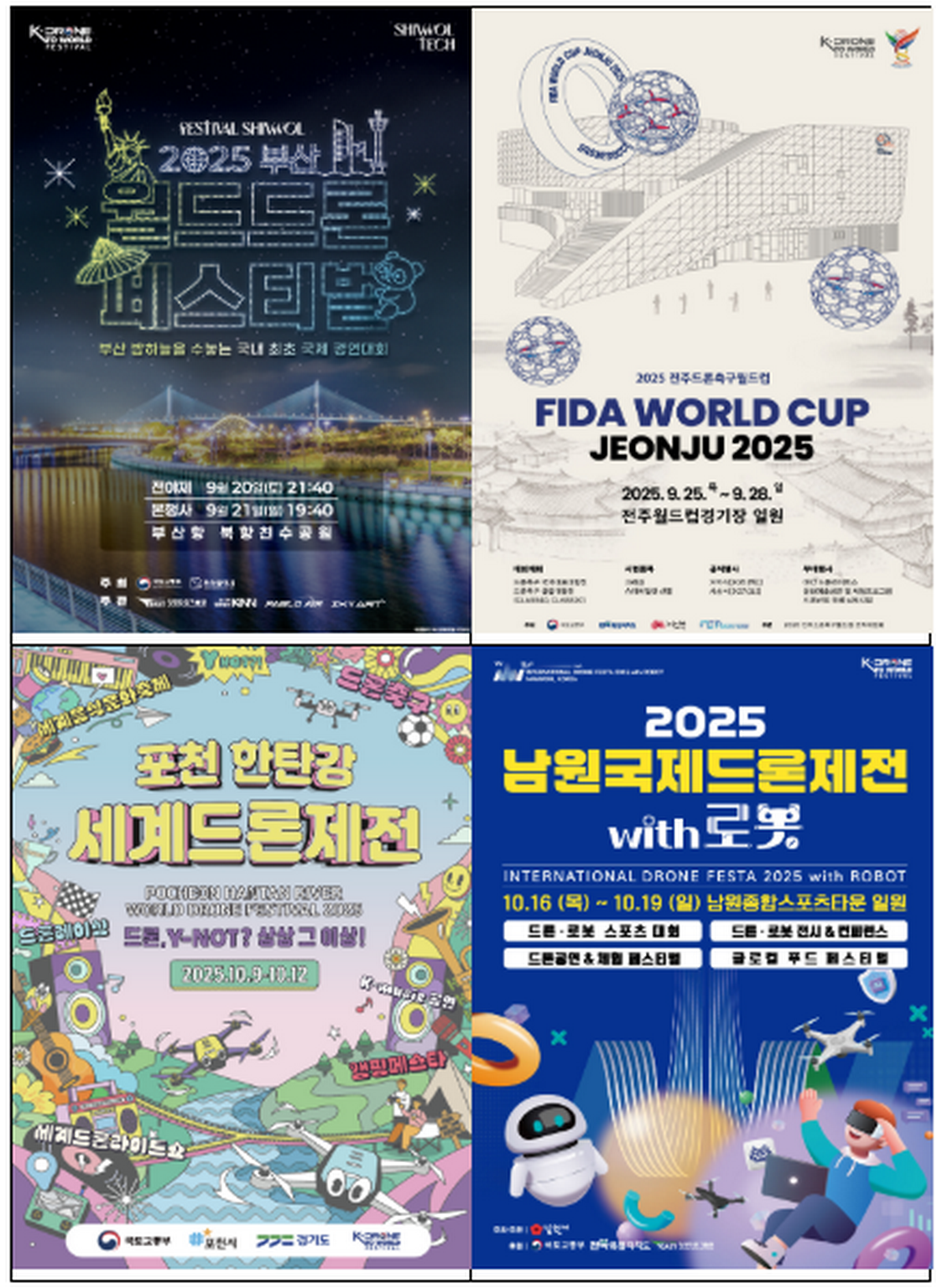 대미는 남원에서 장식한다. 10월 16일부터 19일까지 남원종합스포츠타운에서 열리는 ‘국제드론제전 with 로봇’은 드론레이싱, 드론축구, 드론농구 등 다양한 경기와 체험형 콘텐츠로 꾸며진다. 국내 리그인 DFL(Drone Formula League) 국제대회가 열리며, 드론과 로봇을 직접 조종할 수 있는 전시·체험 행사도 마련된다.