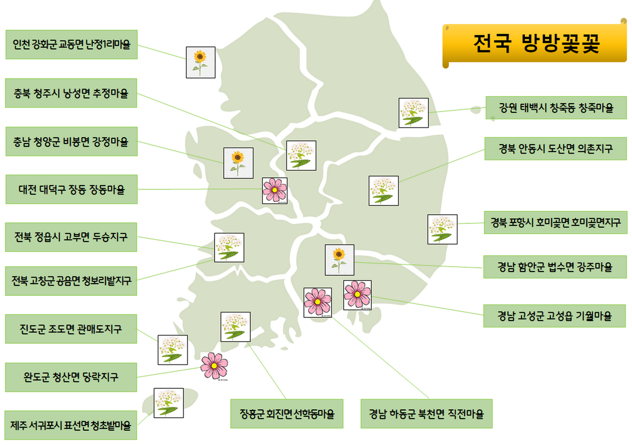 가을의 절정기인 9~10월은 메밀, 해바라기, 코스모스가 농촌을 수놓는 시기다. 전북 정읍 고부면 두승지구와 고창 청보리밭, 전남 장흥 회진 선학동마을, 경북 포항 호미곶지구, 경남 하동 북천 직전마을은 메밀꽃이 장관을 이루는 대표 명소다. 해바라기밭은 인천 강화 교동면 난정1리와 경남 함안 법수면 강주마을에서 황금빛 물결을 자랑하며, 코스모스는 대전 대덕 장동마을, 전남 해남 산이면 대진마을, 전남 완도 청산 당락지구, 경남 고성 기월마을, 하동 북천 이명마을 등에서 흐드러지게 핀다.