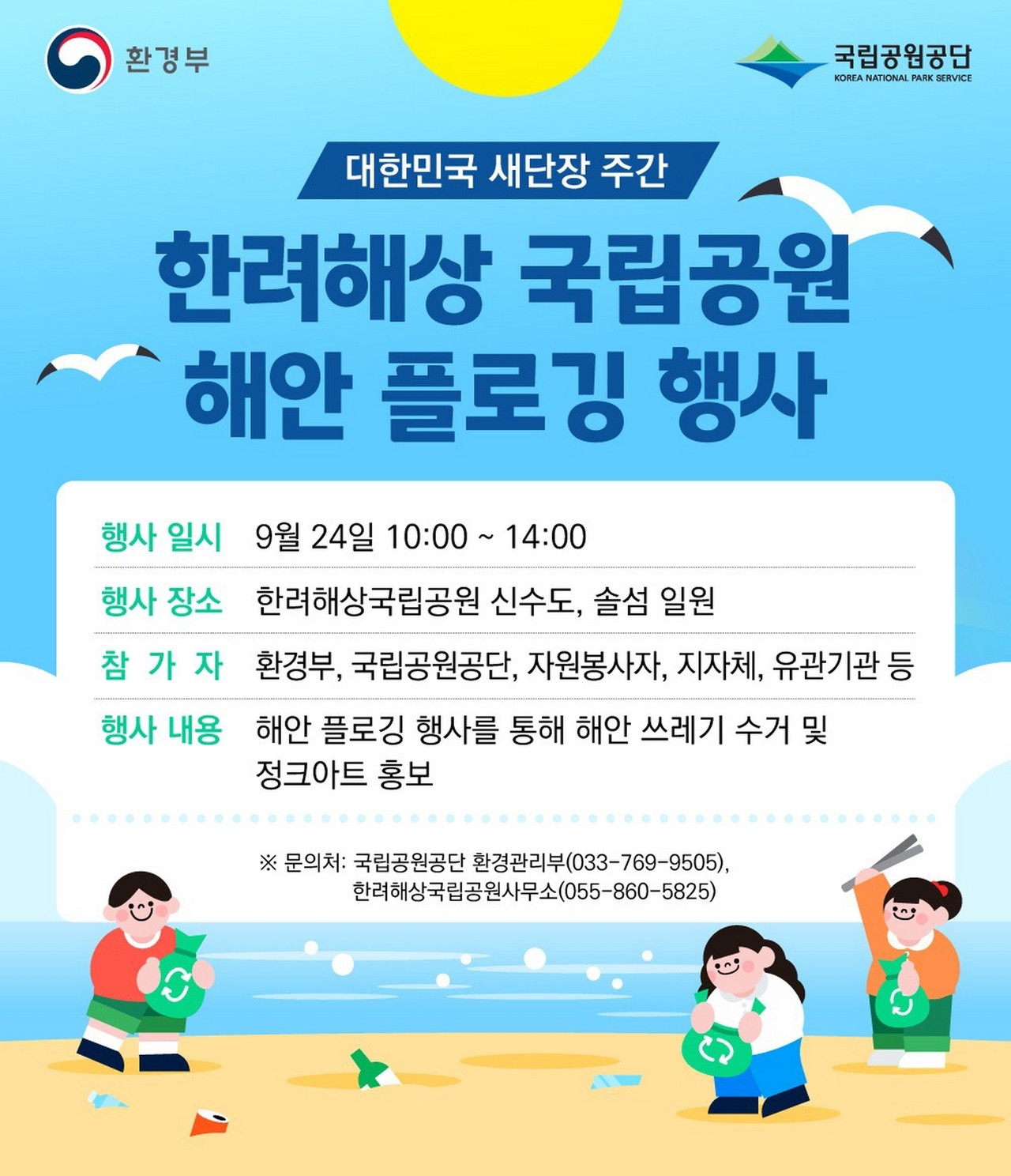 국립공원의 해안이 시민들의 손길로 새롭게 태어난다. 환경부 산하 국립공원공단은 9월 22일부터 10월 1일까지 ‘대한민국 새단장’ 주간을 맞아 해상·해안 국립공원에서 대대적인 쓰레기줍기(플로깅) 활동과 국민 참여형 온라인 인증 행사를 진행한다. 이번 캠페인은 국토대청소의 일환으로 기획됐으며, 바다와 해안을 지키는 환경 정화에 국민적 동참을 이끌어내는 데 목적이 있다.