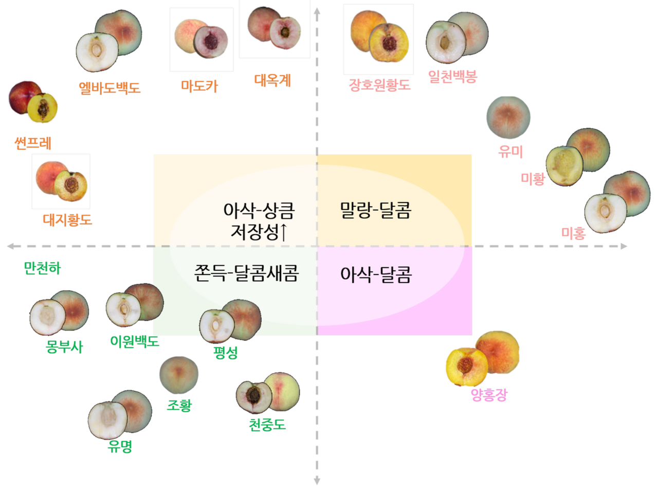 농촌진흥청은 전국 주요 산지유통센터(APC)를 통해 출하된 복숭아 샘플을 채집하고, 출하 규격과 소비지 유통(출하 후 최대 3일) 상황을 반영해 품질 지표를 측정했다. 당도는 당도계(Brix)로, 과육의 단단함은 경도계로, 신맛은 전형적인 산도 측정 방식으로, 여기에 당산비(단맛과 신맛의 비율)를 계산해 네 가지 핵심 축을 만들었다. 이렇게 확보한 데이터를 다차원으로 분석해 시각적으로 이해하기 쉬운 ‘맛 지도’로 구현한 결과, 18개 품종은 ‘아삭-상큼’, ‘쫀득-달콤새콤’, ‘말랑-달콤’, ‘아삭-달콤’의 네 묶음으로 명확히 구분됐다.
