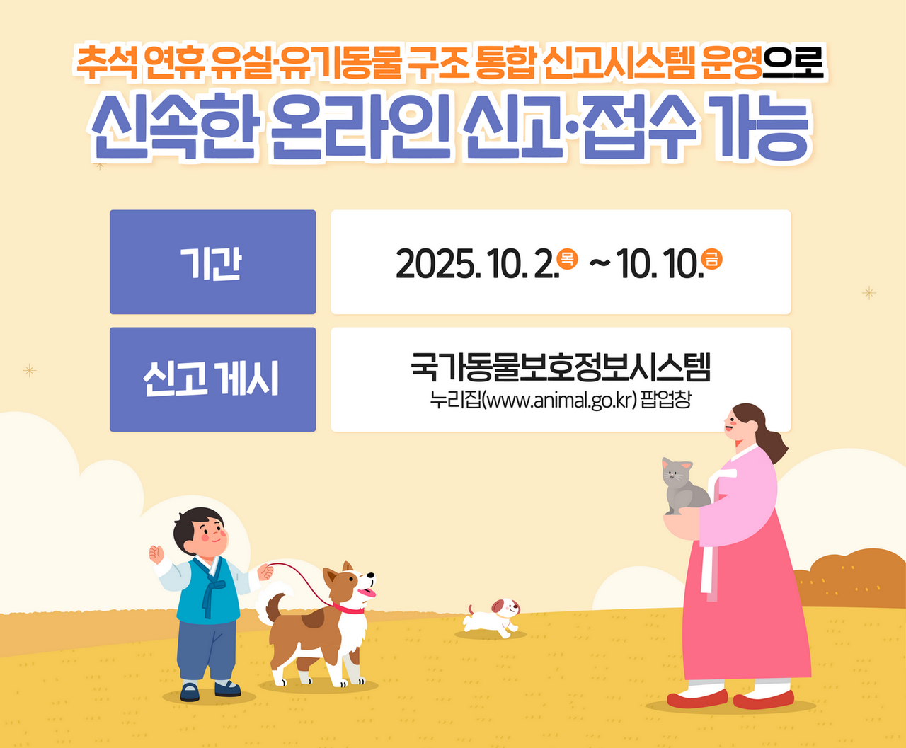 추석 귀성·귀경길로 집을 비우는 동안 반려동물이 길을 잃거나 갑자기 아파도 걱정을 덜 수 있는 대책이 가동된다. 농림축산식품부는 연휴 기간에도 유실·유기동물 구조와 동물 의료서비스를 공백 없이 운영한다고 25일 밝혔다.