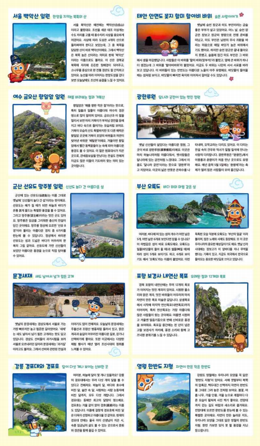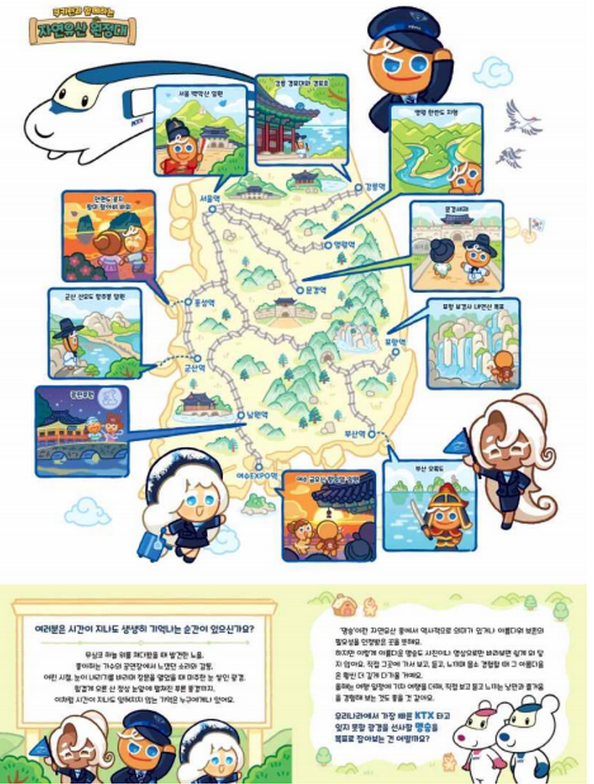 쿠키런 캐릭터가 안내하는 특별한 기차 여행이 시작된다. 국가유산청과 한국철도공사, 그리고 글로벌 인기 게임사 데브시스터즈가 손을 잡고 ‘자연유산 테마지도(기차여행 명승 편)’를 제작해 9월 30일부터 전국 10개 기차역에서 무료로 배포한다. 세계적으로 사랑받는 게임 ‘쿠키런’ 캐릭터들이 우리나라 명승을 안내자로 나서면서, 전통과 현대 문화가 결합된 새로운 방식의 자연유산 홍보가 펼쳐지는 것이다.