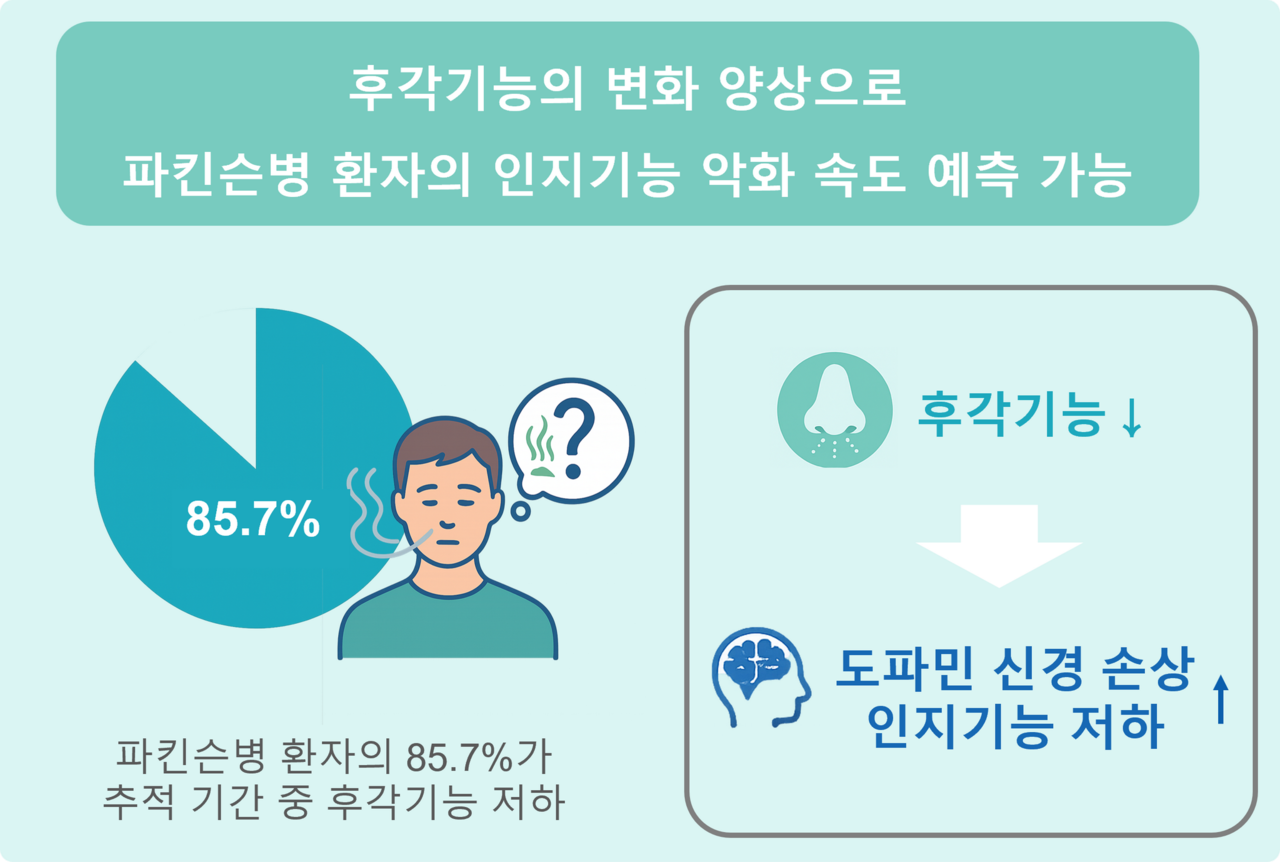 국립보건연구원이 수행 중인 ‘파킨슨병 환자 코호트 연구(BRIDGE-LoPD)’에서 밝혀진 이번 결과는, 환자의 후각 기능 저하가 인지장애(치매)로의 진행 속도를 가늠하는 핵심 지표로 작용할 수 있다는 점을 확인했다. 단순히 냄새를 구분하거나 감지하는 능력만으로도, 환자의 뇌가 얼마나 빠르게 인지 기능을 잃어가고 있는지를 예측할 수 있는 것이다.