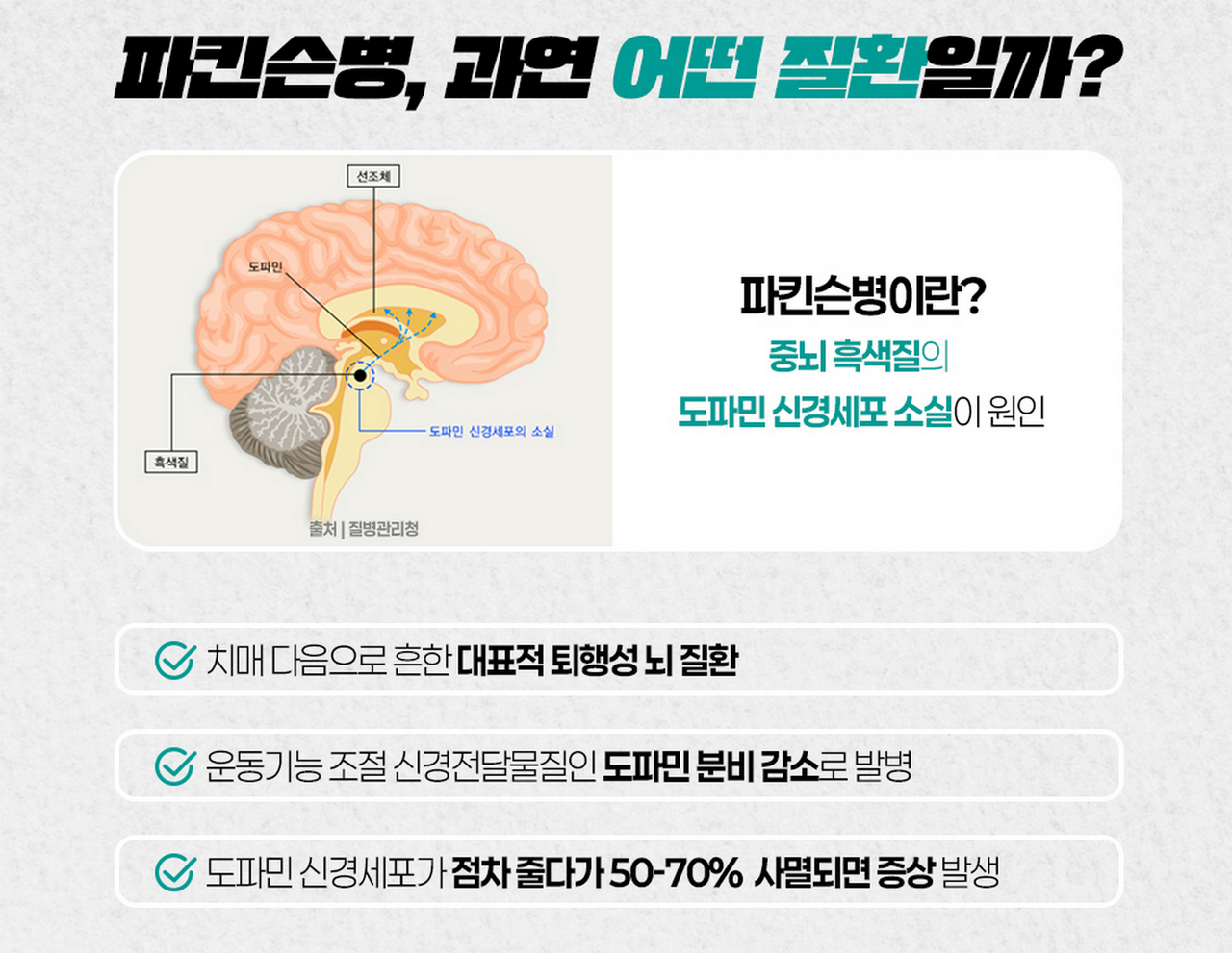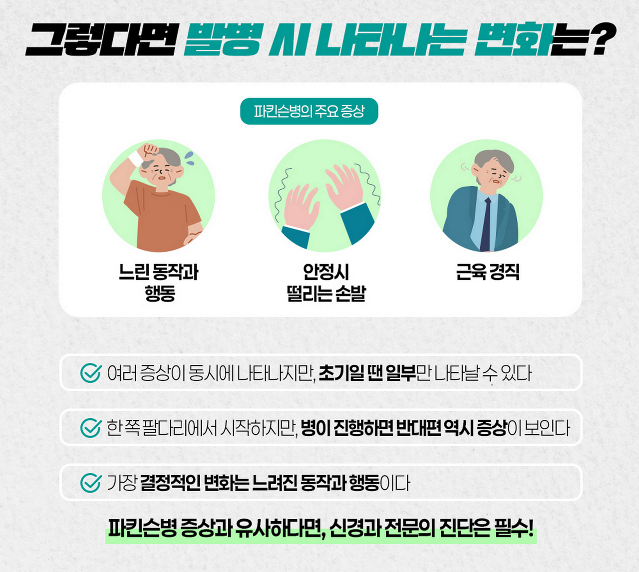 파킨슨병은 단순한 운동 장애 질환이 아닌 ‘전신 신경계 퇴행 질환’으로, 조기 인지와 관리가 생명이다.