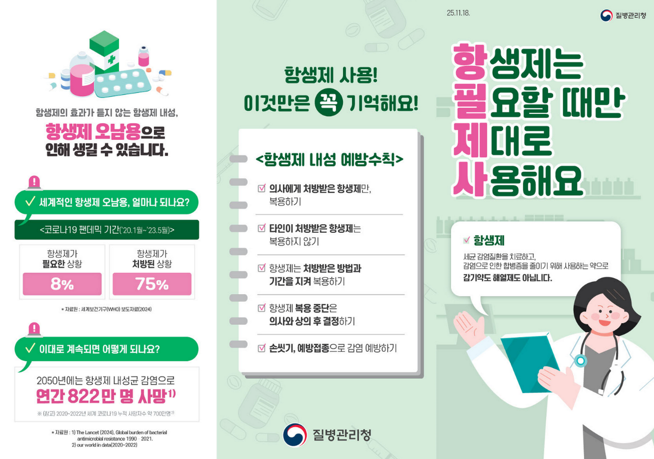 항생제 한 알의 선택이 미래를 바꾼다. 잘못된 복용은 그 순간 끝나지만, 내성은 평생을 따라붙는다. 질병관리청이 ‘세계 항생제 내성 인식주간(11월 18~24일)’을 맞아 항생제 내성의 심각성을 알리고 올바른 사용을 촉구하는 대국민 캠페인을 시작한다.