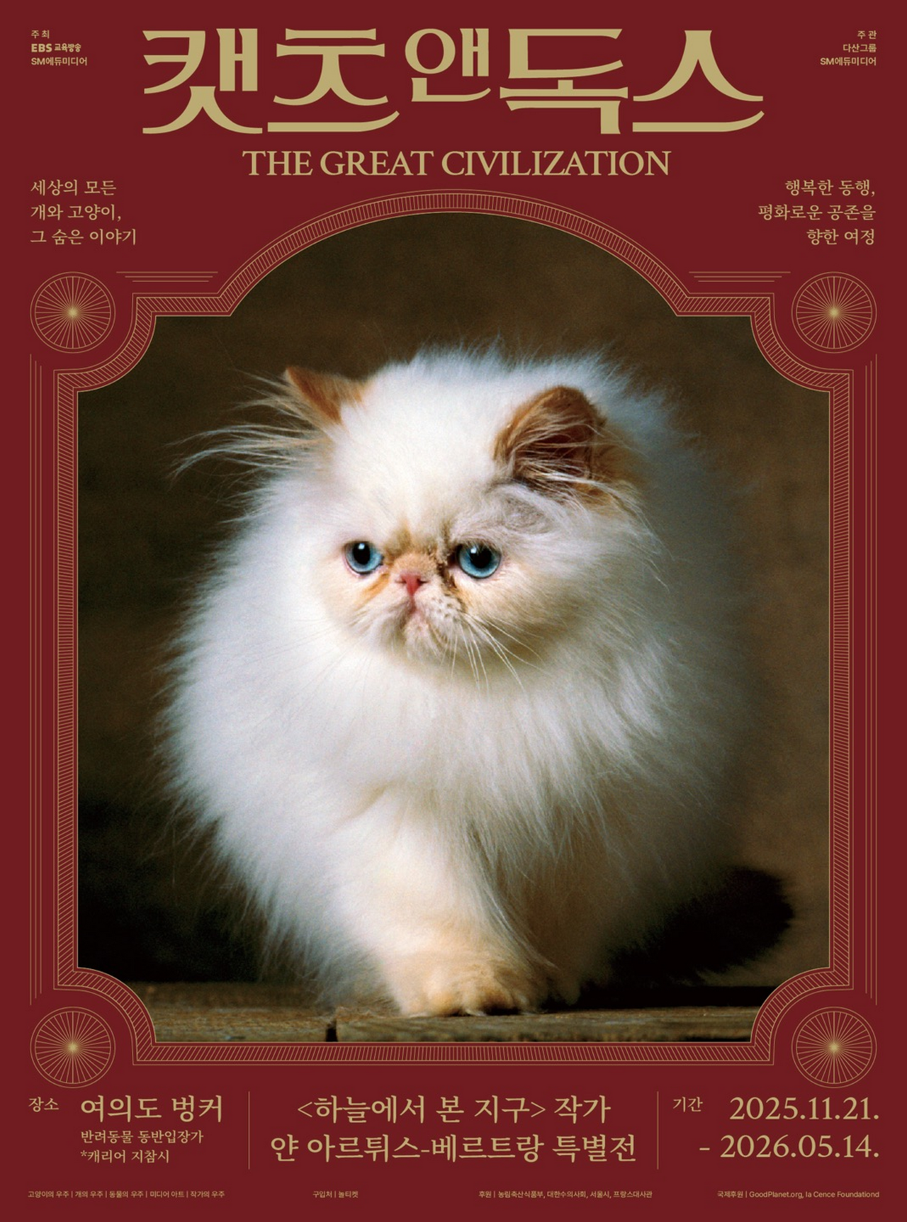 수십 년 동안 잠겨 있던 여의도 지하벙커가 다시 열린다. 차가운 콘크리트 벽으로 둘러싸인 폐쇄 공간이 세계적 작가의 감각과 시민의 참여로 채워지며 서울의 새로운 문화 실험장이 된다. 서울시는 2025년 11월 21일부터 2026년 5월 14일까지 사진가 얀 아르튀스-베르트랑의 사진·영상 전시 <캣츠 앤 독스 : THE GREAT CIVILIZATION>을 여의도 지하벙커에서 개최한다고 밝혔다.